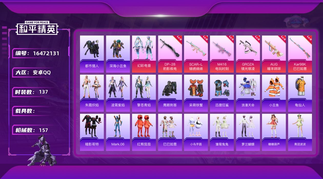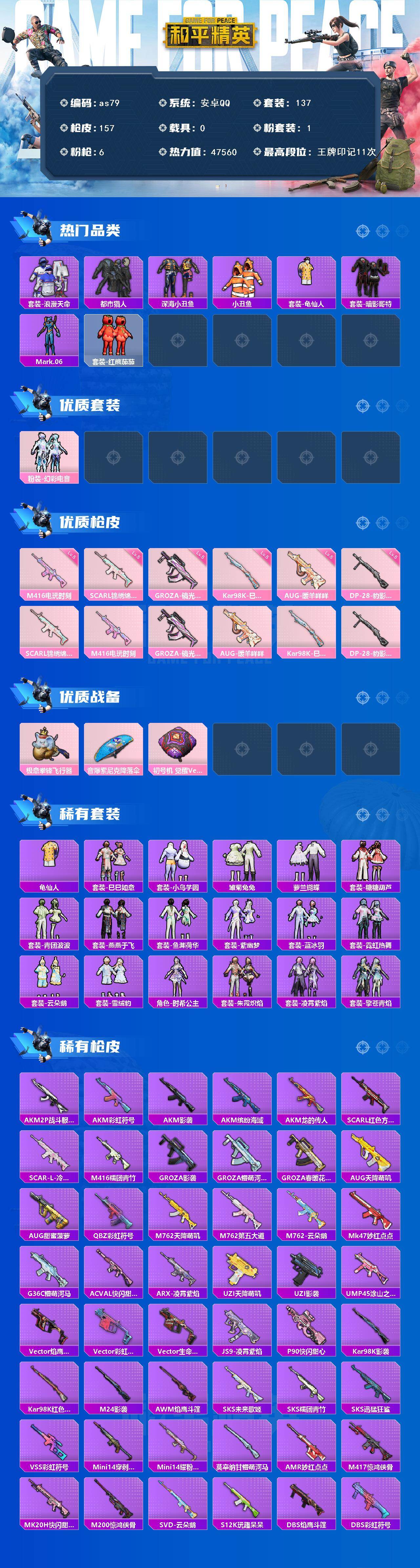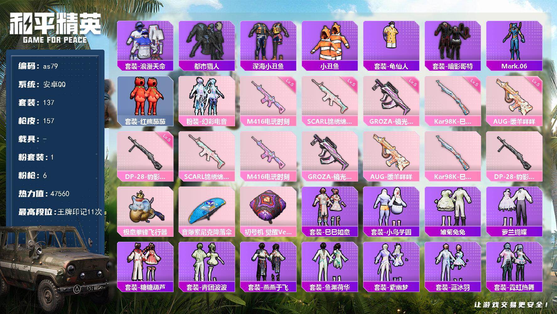 [16472131]安卓 手Q-1粉装-6特效枪-0载具-3粉色飞行器-47560热力值-11王牌印记-137套装-157枪皮 【热门品类】:套装-浪漫天命,套装-都市猎人,套装-深海小丑鱼,套装-小丑鱼,套装-龟仙人,套装-暗影哥特,角色-Mark.06,套装-红熊茄茄 【粉色套装】:粉装-幻彩电音 【粉色枪皮等级】:SCAR-L-锦绣绵绵(五级),M416-电玩时刻(五级),GROZA-镜光银凌(五级),AUG-暖羊咩咩(五级),Kar98K-巳巳如意(五级),DP-28-豹影疾电(五级) 【粉色枪皮】:SCAR-L-锦绣绵绵,M416-电玩时刻,GROZA-镜光银凌,AUG-暖羊咩咩,Kar98K-巳巳如意,DP-28-豹影疾电 【粉色飞行器】:极意拳锋飞行器 【粉色降落伞】:音爆索尼克降落伞,初号机 觉醒Ver.降落伞,炫彩糖果降落伞 【稀有套装】:套装-龟仙人,套装-巳巳如意,套装-小鸟芋圆,套装-雪国风尚,套装-炫彩糖果,套装-雏菊兔兔,套装-萝兰蝴蝶,套装-糖糖葫芦,套装-青团波波,套装-燕燕于飞,套装-鱼渊荷华,套装-紫幽梦,套装-蓝冰羽,套装-霓虹热舞,套装-云朵鹅,套装-雪绒豹,角色-时希公主,套装-朱霞炽焰,套装-凌霄紫焰,套装-擎苍青焰 【稀有枪皮】:AUG-冰晶雪宝,AKM-2P战斗服款,AKM-彩虹符号,AKM-影袭,AKM-缤纷海域,AKM-龙的传人,SCAR-L-红色方程式,SCAR-L-冷漠罗丽,M416-糯团青竹,GROZA-影袭,GROZA-懵萌河马,GROZA-春暖花开,AUG-天降萌叽,AUG-甜蜜菠萝,QBZ-彩虹符号,M762-天降萌叽,M762-第五大道,M762-云朵鹅,Mk47-妙红点点,G36C-懵萌河马,AC-VAL-快闪甜心,ARX-凌霄紫焰,UZI-天降萌叽,UZI-影袭,UMP45-涂山之恋,Vector-焰鹰斗篷,Vector-彩虹符号,Vector-生命誓言,JS9-凌霄紫焰,P90-快闪甜心,Kar98K-影袭,Kar98K-红色方程式,M24-影袭,AWM-焰鹰斗篷,SKS-未来歌姬,SKS-糯团青竹,SKS-迅猛狂鲨,VSS-彩虹符号,Mini14-穿刺龙虾,Mini14-耀粉歌者,莫辛纳甘-懵萌河马,AMR-妙红点点,M417-惊鸿侠骨,MK20-H-快闪甜心,M200-惊鸿侠骨,SVD-云朵鹅,S12K-玩趣