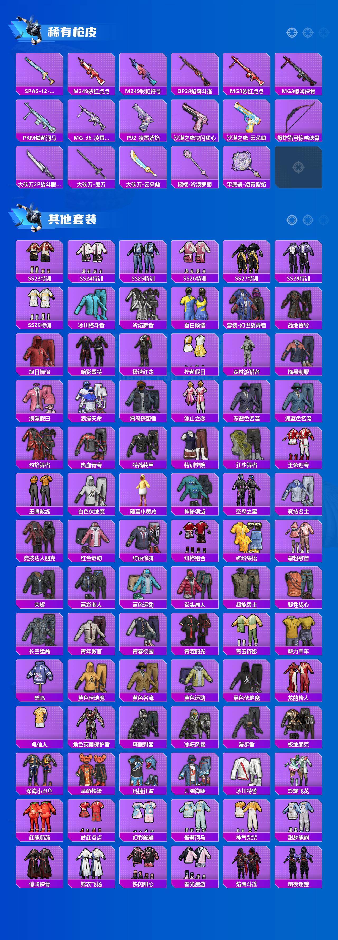 【稀有枪皮】:AUG-冰晶雪宝,AKM-2P战斗服款,AKM-彩虹符号,AKM-影袭,AKM-缤纷海域,AKM-龙的传人,SCAR-L-红色方程式,SCAR-L-冷漠罗丽,M416-糯团青竹,GROZA-影袭,GROZA-懵萌河马,GROZA-春暖花开,AUG-天降萌叽,AUG-甜蜜菠萝,QBZ-彩虹符号,M762-天降萌叽,M762-第五大道,M762-云朵鹅,Mk47-妙红点点,G36C-懵萌河马,AC-VAL-快闪甜心,ARX-凌霄紫焰,UZI-天降萌叽,UZI-影袭,UMP45-涂山之恋,Vector-焰鹰斗篷,Vector-彩虹符号,Vector-生命誓言,JS9-凌霄紫焰,P90-快闪甜心,Kar98K-影袭,Kar98K-红色方程式,M24-影袭,AWM-焰鹰斗篷,SKS-未来歌姬,SKS-糯团青竹,SKS-迅猛狂鲨,VSS-彩虹符号,Mini14-穿刺龙虾,Mini14-耀粉歌者,莫辛纳甘-懵萌河马,AMR-妙红点点,M417-惊鸿侠骨,MK20-H-快闪甜心,M200-惊鸿侠骨,SVD-云朵鹅,S12K-玩趣