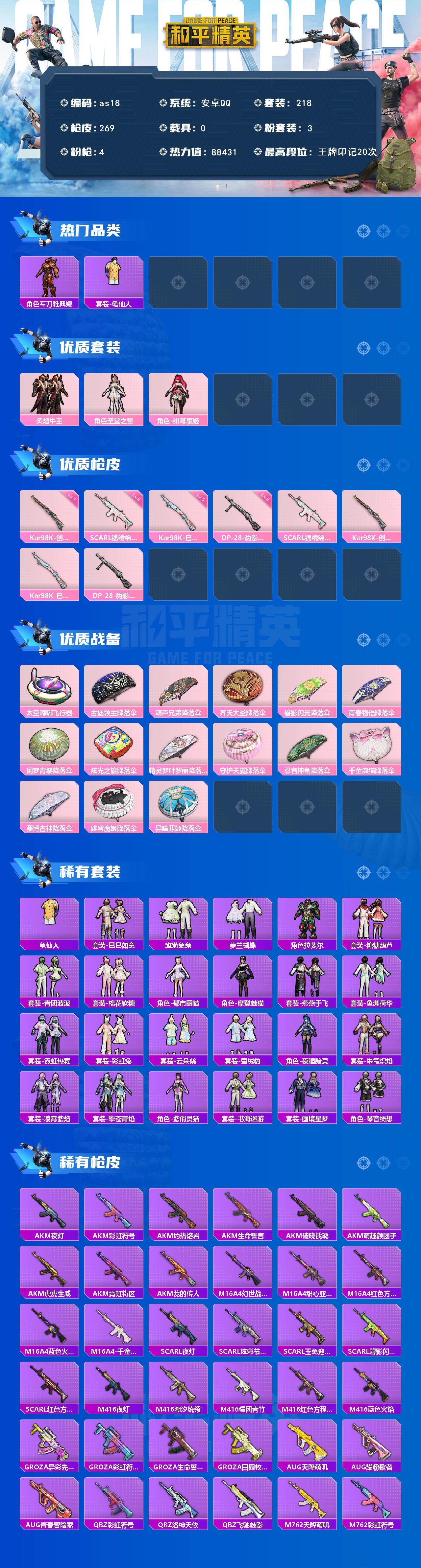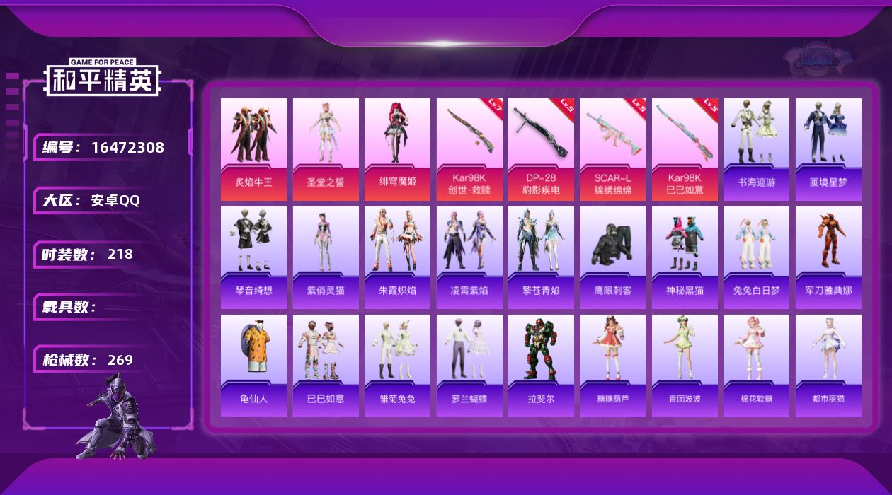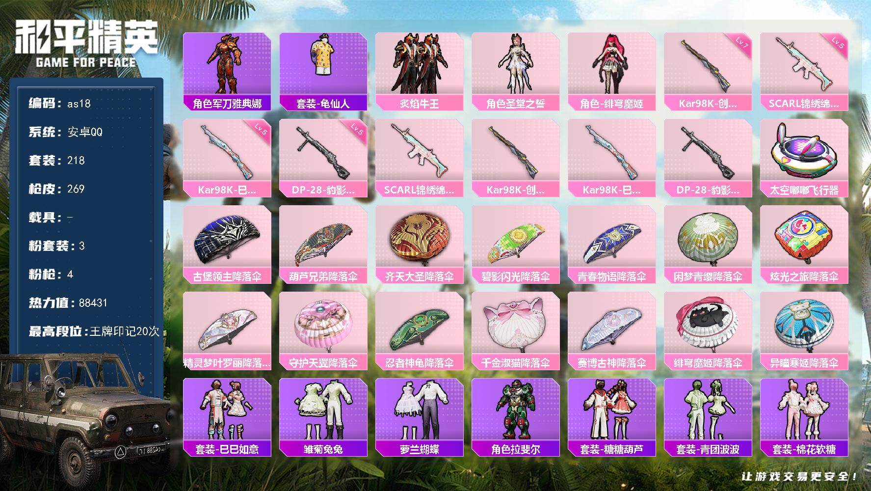 [16472308]安卓 手Q-3粉装-4特效枪-0载具-2粉色飞行器-88431热力值-20王牌印记-218套装-269枪皮 【热门品类】:角色-军刀雅典娜,套装-龟仙人 【粉色套装】:粉装-炙焰牛王,角色-圣堂之誓,角色-绯穹魔姬 【粉色枪皮等级】:SCAR-L-锦绣绵绵(五级),Kar98K-创世·救赎(七级),Kar98K-巳巳如意(五级),DP-28-豹影疾电(五级) 【粉色枪皮】:SCAR-L-锦绣绵绵,Kar98K-创世·救赎,Kar98K-巳巳如意,DP-28-豹影疾电 【粉色飞行器】:太空嘟嘟飞行器 【粉色降落伞】:古堡领主降落伞,葫芦兄弟降落伞,齐天大圣降落伞,碧影闪光降落伞,青春物语降落伞,闲梦青缨降落伞,炫光之旅降落伞,精灵梦叶罗丽降落伞,守护天翼降落伞,忍者神龟降落伞,千金淑猫降落伞,赛博古神降落伞,绯穹魔姬降落伞,异瞳寒姬降落伞 【稀有套装】:套装-龟仙人,套装-巳巳如意,套装-雪国风尚,套装-雏菊兔兔,套装-萝兰蝴蝶,角色-拉斐尔,套装-糖糖葫芦,套装-青团波波,套装-棉花软糖,角色-都市丽猫,角色-摩登魅猫,套装-燕燕于飞,套装-鱼渊荷华,套装-霓虹热舞,套装-彩虹兔,套装-云朵鹅,套装-雪绒豹,角色-夜瞳黯灵,套装-朱霞炽焰,套装-凌霄紫焰,套装-擎苍青焰,角色-紫俏灵猫,套装-书海巡游,套装-画境星梦,套装-琴音绮想 【稀有枪皮】:AKM-夜灯,AKM-彩虹符号,AKM-灼热熔岩,AKM-生命誓言,AKM-破晓战魂,AKM-萌趣颜团子,AKM-虎虎生威,AKM-霓虹街区,AKM-龙的传人,M16A4-幻世战舞者,M16A4-甜心亚梦,M16A4-红色方程式,M16A4-蓝色火焰,M16A4-千金淑猫,SCAR-L-夜灯,SCAR-L-炫彩节奏,SCAR-L-玉兔迎春,SCAR-L-碧影闪光,SCAR-L-红色方程式,M416-夜灯,M416-潮汐统领,M416-糯团青竹,M416-红色方程式,M416-蓝色火焰,GROZA-异彩先驱,GROZA-彩虹符号,GROZA-生命誓言,GROZA-田园牧歌,AUG-天降萌叽,AUG-耀粉歌者,AUG-青春冒险家,QBZ-彩虹符号,QBZ-洛神天依,QBZ-飞驰魅影,M762-天降萌叽,M762-彩虹符号,M762-牛气冲天,M762-瑞龙福将,M762-云朵鹅,Mk47-妙红点点,G36C-时空追击者,AC