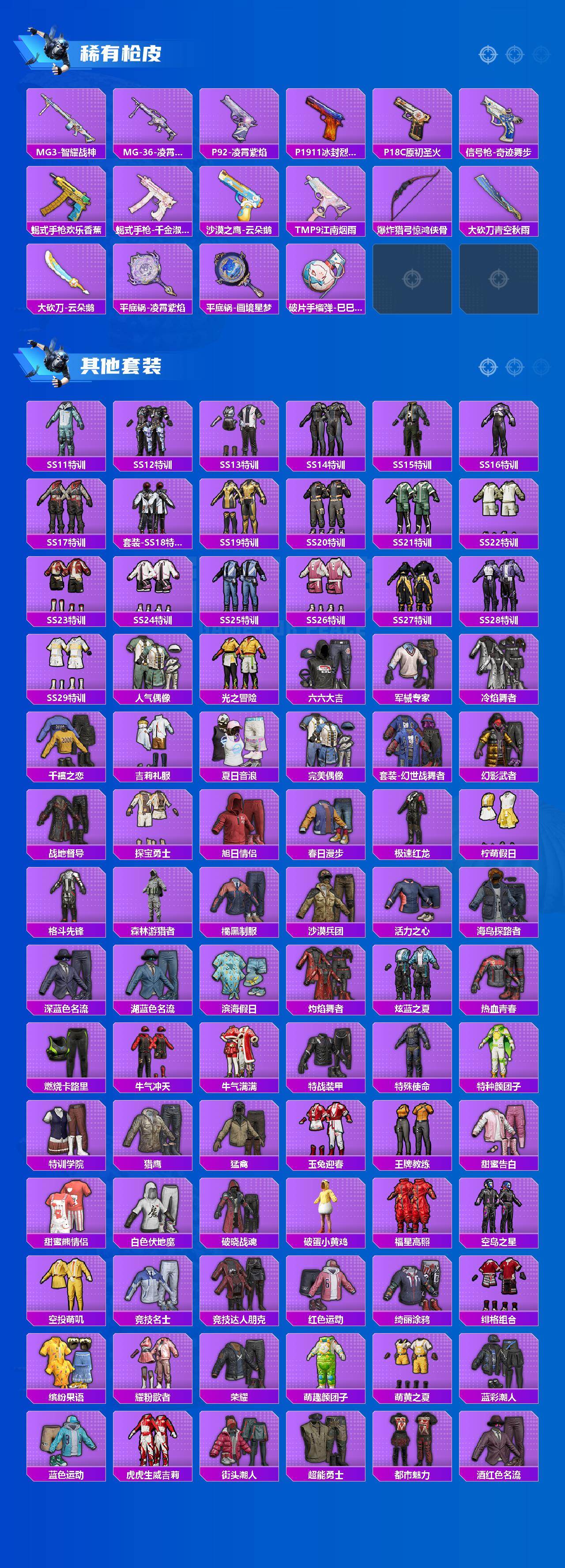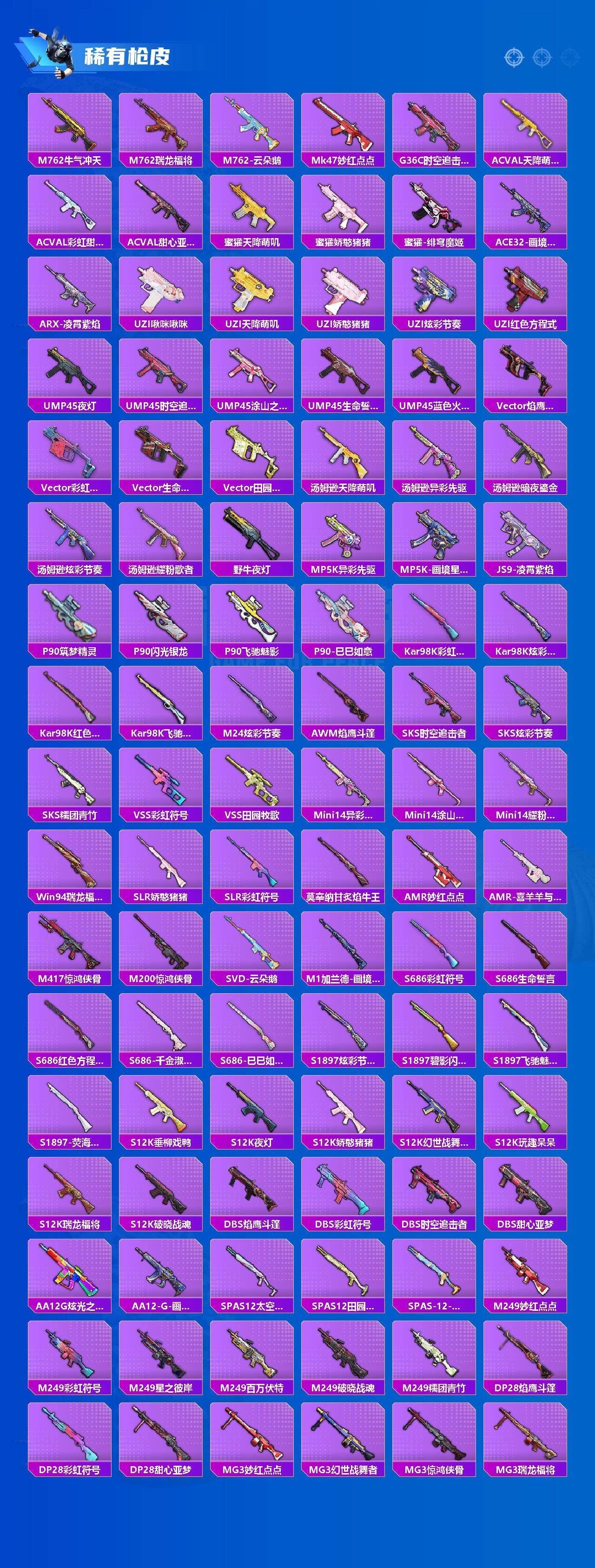 【稀有枪皮】:AKM-夜灯,AKM-彩虹符号,AKM-灼热熔岩,AKM-生命誓言,AKM-破晓战魂,AKM-萌趣颜团子,AKM-虎虎生威,AKM-霓虹街区,AKM-龙的传人,M16A4-幻世战舞者,M16A4-甜心亚梦,M16A4-红色方程式,M16A4-蓝色火焰,M16A4-千金淑猫,SCAR-L-夜灯,SCAR-L-炫彩节奏,SCAR-L-玉兔迎春,SCAR-L-碧影闪光,SCAR-L-红色方程式,M416-夜灯,M416-潮汐统领,M416-糯团青竹,M416-红色方程式,M416-蓝色火焰,GROZA-异彩先驱,GROZA-彩虹符号,GROZA-生命誓言,GROZA-田园牧歌,AUG-天降萌叽,AUG-耀粉歌者,AUG-青春冒险家,QBZ-彩虹符号,QBZ-洛神天依,QBZ-飞驰魅影,M762-天降萌叽,M762-彩虹符号,M762-牛气冲天,M762-瑞龙福将,M762-云朵鹅,Mk47-妙红点点,G36C-时空追击者,AC