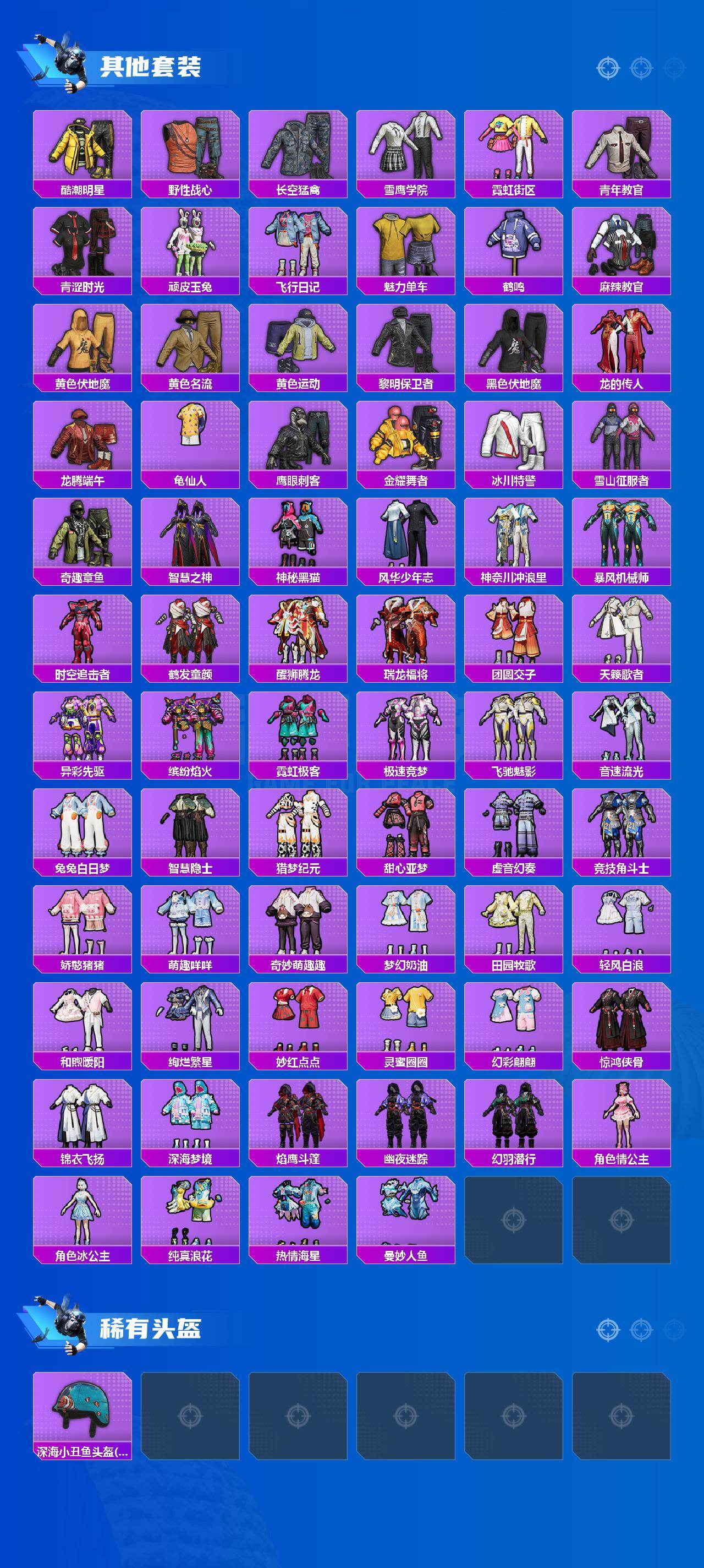 【稀有套装】:套装-龟仙人,套装-巳巳如意,套装-雪国风尚,套装-雏菊兔兔,套装-萝兰蝴蝶,角色-拉斐尔,套装-糖糖葫芦,套装-青团波波,套装-棉花软糖,角色-都市丽猫,角色-摩登魅猫,套装-燕燕于飞,套装-鱼渊荷华,套装-霓虹热舞,套装-彩虹兔,套装-云朵鹅,套装-雪绒豹,角色-夜瞳黯灵,套装-朱霞炽焰,套装-凌霄紫焰,套装-擎苍青焰,角色-紫俏灵猫,套装-书海巡游,套装-画境星梦,套装-琴音绮想