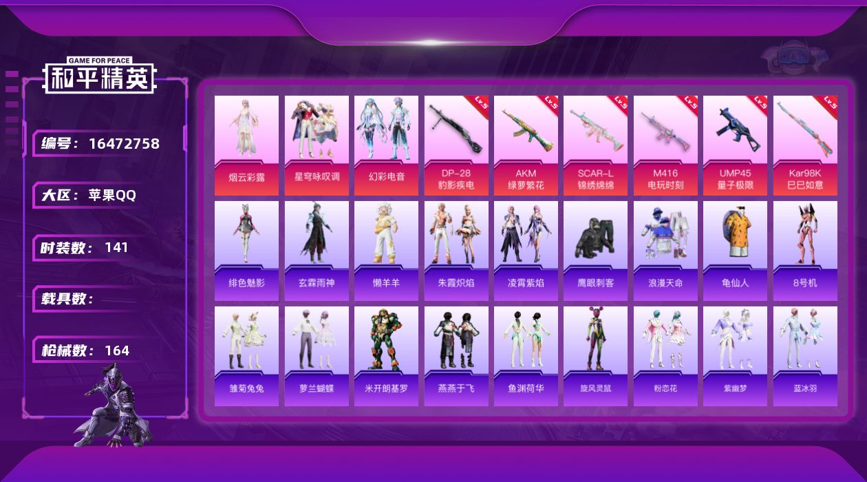 [16472758]苹果 手Q-4粉装-6特效枪-0载具-1粉色飞行器-48234热力值-5王牌印记-141套装-164枪皮