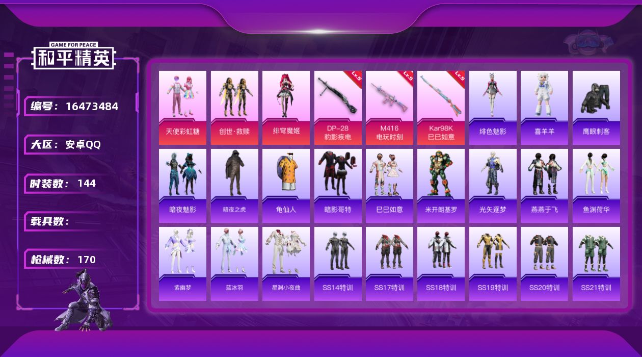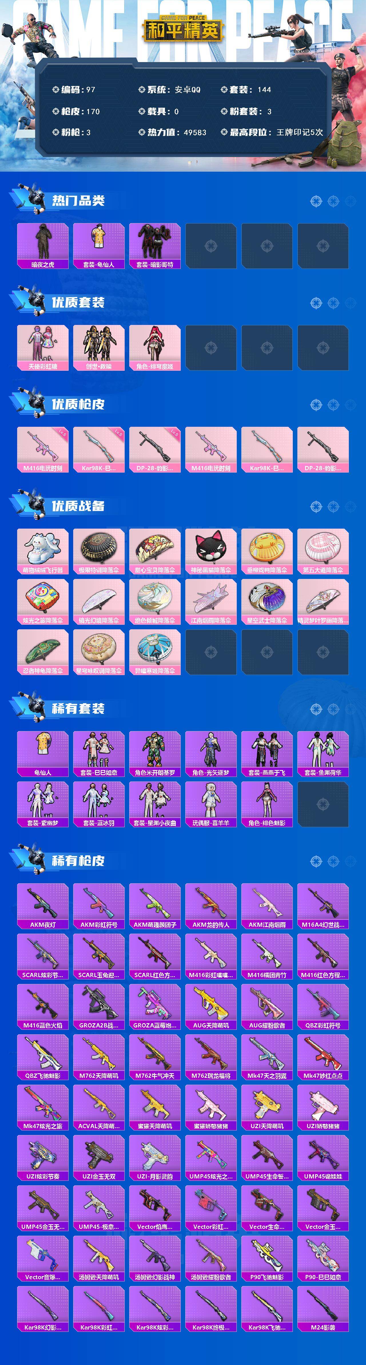 [16473484]安卓 手Q-3粉装-3特效枪-0载具-2粉色飞行器-49583热力值-5王牌印记-144套装-170枪皮 【热门品类】:套装-暗夜之虎,套装-龟仙人,套装-暗影哥特 【粉色套装】:粉装-天使彩虹糖,套装-创世·救赎,角色-绯穹魔姬 【粉色枪皮等级】:M416-电玩时刻(五级),Kar98K-巳巳如意(五级),DP-28-豹影疾电(五级) 【粉色枪皮】:M416-电玩时刻,Kar98K-巳巳如意,DP-28-豹影疾电 【粉色飞行器】:萌物绒绒飞行器 【粉色降落伞】:极限特训降落伞,甜心宝贝降落伞,神秘黑猫降落伞,垂柳戏鸭降落伞,第五大道降落伞,炫光之旅降落伞,镜光幻境降落伞,绝色倾城降落伞,江南烟雨降落伞,星空武士降落伞,精灵梦叶罗丽降落伞,忍者神龟降落伞,星穹咏叹调降落伞,异瞳寒姬降落伞,炫彩糖果降落伞 【稀有套装】:套装-龟仙人,套装-巳巳如意,套装-炫彩糖果,角色-米开朗基罗,角色-光矢逐梦,套装-燕燕于飞,套装-鱼渊荷华,套装-紫幽梦,套装-蓝冰羽,套装-星渊小夜曲,玩偶服-喜羊羊,角色-绯色魅影 【稀有枪皮】:AKM-夜灯,AKM-彩虹符号,AKM-江南烟雨,AKM-萌趣颜团子,AKM-龙的传人,M16A4-幻世战舞者,SCAR-L-炫彩节奏,SCAR-L-玉兔迎春,SCAR-L-红色方程式,M416-彩虹嘻嘻猴,M416-糯团青竹,M416-红色方程式,M416-蓝色火焰,GROZA-2B战斗服款,GROZA-蓝莓炮弹,AUG-天降萌叽,AUG-耀粉歌者,QBZ-彩虹符号,QBZ-飞驰魅影,M762-天降萌叽,M762-牛气冲天,M762-瑞龙福将,Mk47-天之羽翼,Mk47-妙红点点,Mk47-炫光之旅,AC-VAL-天降萌叽,蜜獾-天降萌叽,蜜獾-娇憨猪猪,UZI-天降萌叽,UZI-娇憨猪猪,UZI-炫彩节奏,UZI-金玉无双,UZI-月影灵韵,UMP45-炫光之旅,UMP45-生命誓言,UMP45-诡娃娃,UMP45-金玉无双,UMP45-极意拳锋,Vector-焰鹰斗篷,Vector-彩虹符号,Vector-生命誓言,Vector-金玉无双,Vector-音爆索尼克,汤姆逊-天降萌叽,汤姆逊-幻影战神,汤姆逊-耀粉歌者,P90-飞驰魅影,P90-巳巳如意,Kar98K-幻影战神,Kar98K-彩虹符号,Kar98K-炫彩节奏,Kar98K-终极