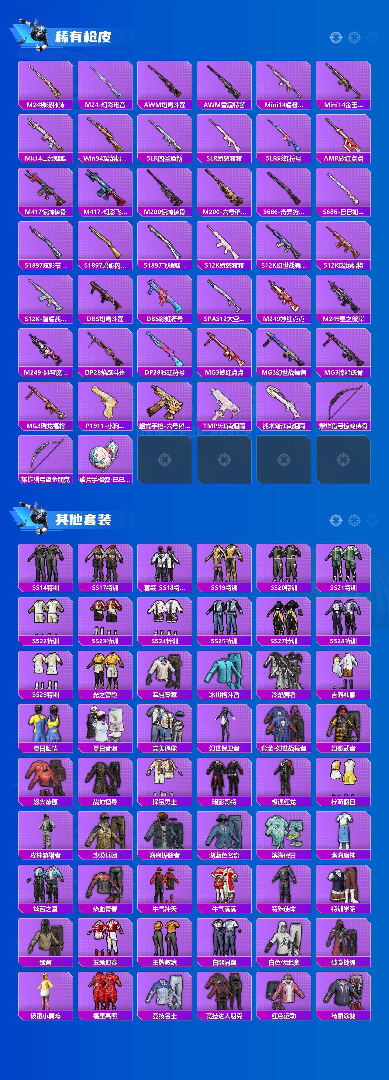 【稀有枪皮】:AKM-夜灯,AKM-彩虹符号,AKM-江南烟雨,AKM-萌趣颜团子,AKM-龙的传人,M16A4-幻世战舞者,SCAR-L-炫彩节奏,SCAR-L-玉兔迎春,SCAR-L-红色方程式,M416-彩虹嘻嘻猴,M416-糯团青竹,M416-红色方程式,M416-蓝色火焰,GROZA-2B战斗服款,GROZA-蓝莓炮弹,AUG-天降萌叽,AUG-耀粉歌者,QBZ-彩虹符号,QBZ-飞驰魅影,M762-天降萌叽,M762-牛气冲天,M762-瑞龙福将,Mk47-天之羽翼,Mk47-妙红点点,Mk47-炫光之旅,AC-VAL-天降萌叽,蜜獾-天降萌叽,蜜獾-娇憨猪猪,UZI-天降萌叽,UZI-娇憨猪猪,UZI-炫彩节奏,UZI-金玉无双,UZI-月影灵韵,UMP45-炫光之旅,UMP45-生命誓言,UMP45-诡娃娃,UMP45-金玉无双,UMP45-极意拳锋,Vector-焰鹰斗篷,Vector-彩虹符号,Vector-生命誓言,Vector-金玉无双,Vector-音爆索尼克,汤姆逊-天降萌叽,汤姆逊-幻影战神,汤姆逊-耀粉歌者,P90-飞驰魅影,P90-巳巳如意,Kar98K-幻影战神,Kar98K-彩虹符号,Kar98K-炫彩节奏,Kar98K-终极