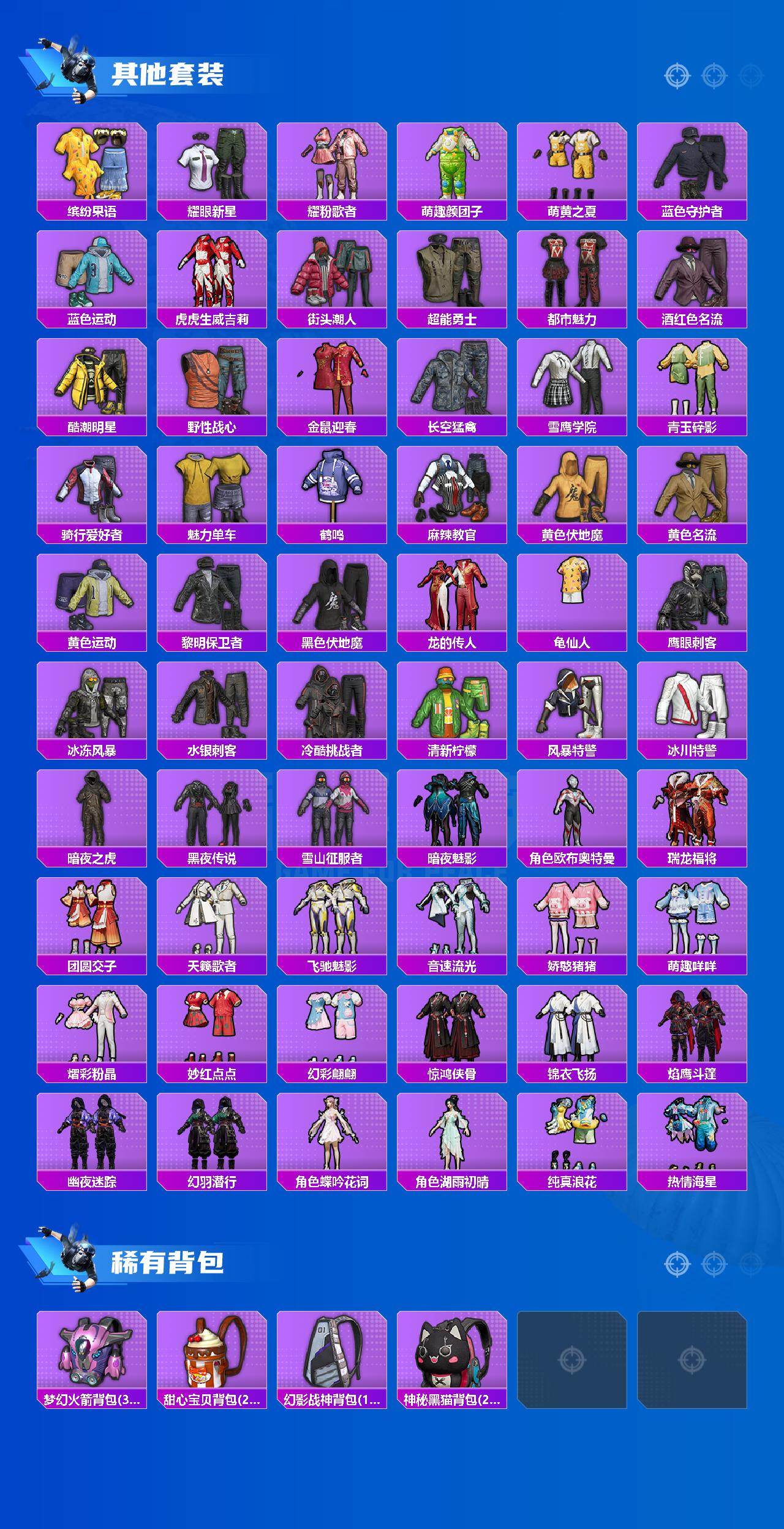 【稀有套装】:套装-龟仙人,套装-巳巳如意,套装-炫彩糖果,角色-米开朗基罗,角色-光矢逐梦,套装-燕燕于飞,套装-鱼渊荷华,套装-紫幽梦,套装-蓝冰羽,套装-星渊小夜曲,玩偶服-喜羊羊,角色-绯色魅影