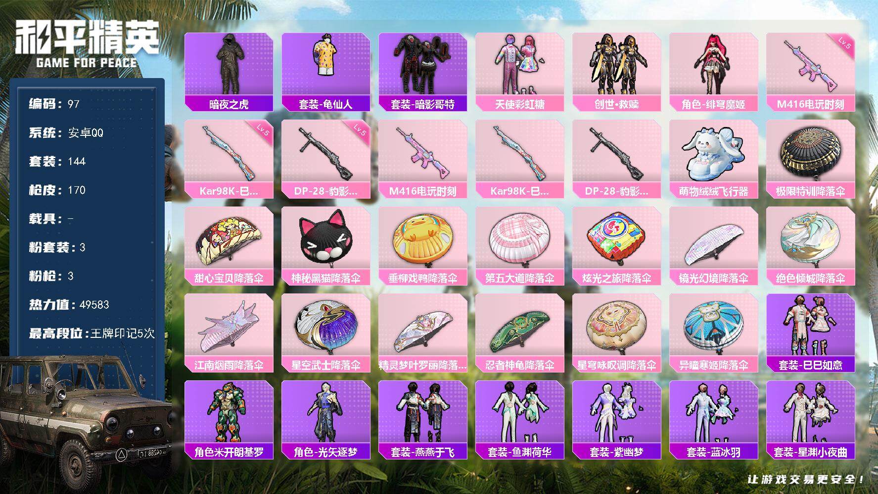 [16473484]安卓 手Q-3粉装-3特效枪-0载具-2粉色飞行器-49583热力值-5王牌印记-144套装-170枪皮