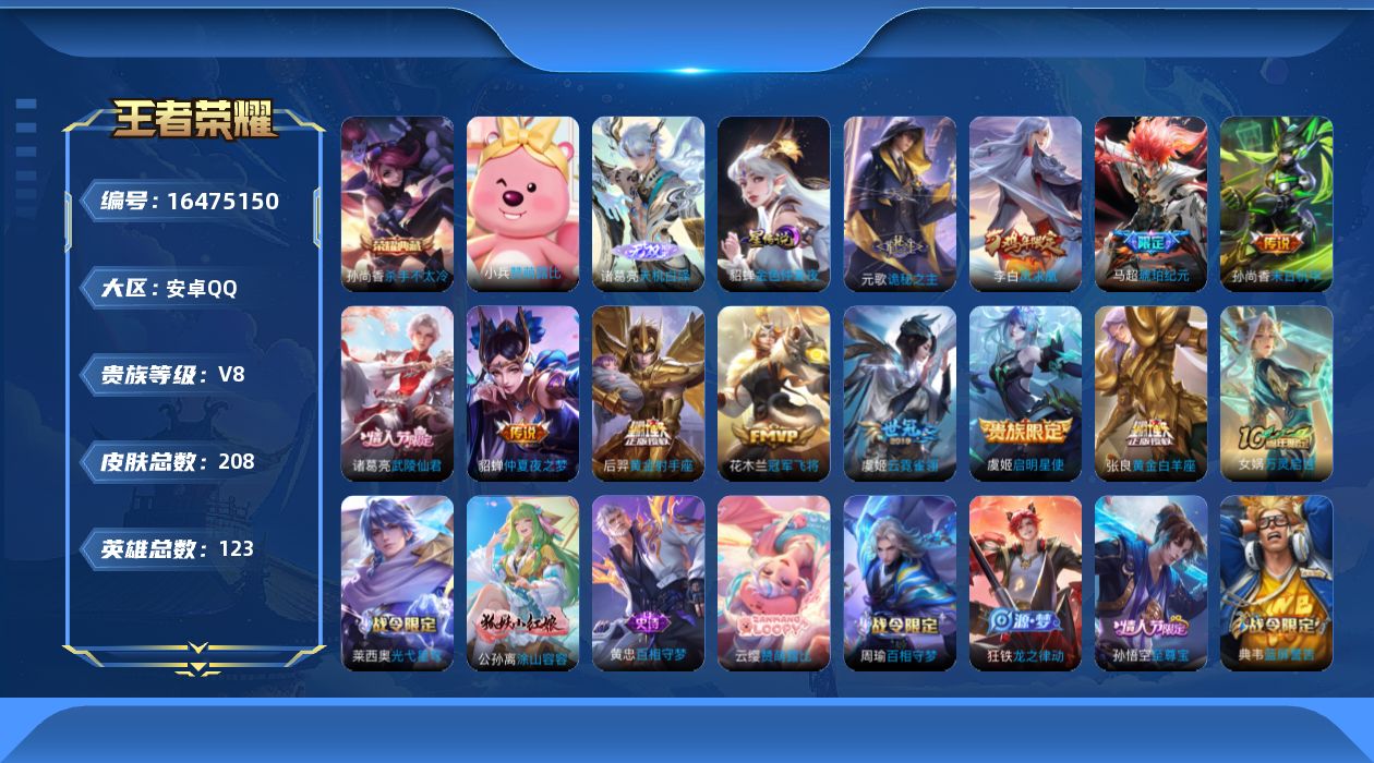 [16475150]可二次【特价出售/店主推荐】安卓Q-V8-最强王者段位-123英雄-208皮肤-1典藏皮肤-1无双-1星传说-12传说-55史诗