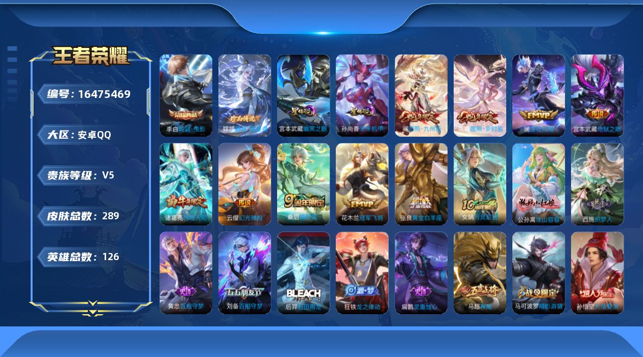 [16475469]可二次【特价出售/店主推荐】安卓Q-V5-最强王者段位-126英雄-289皮肤-1典藏皮肤-1珍品传说-2星传说-9传说-93史诗 【英雄全皮】:影全皮 【荣耀典藏】:李白鸣剑曳影 【珍品传说】:嫦娥器灵落星盏 【传说皮肤】:澜愿照九州拓,虞姬愿照岁时盈,云缨幻光神枪,桑启鸣野蒿,澜逐花归海,诸葛亮时雨天司,张良黄金白羊座,花木兰冠军飞将,宫本武藏地狱之眼 【限定皮肤】:姜子牙天穹之誓,狄仁杰阴阳师,虞姬凯尔特女王,赵云皇家上将,墨子神迹守卫,嬴政白昼王子,孙尚香蔷薇恋人,庄周高山流水,高渐离死亡摇滚,高渐离玩趣恶龙,白起夜都怪侠,芈月重明,芈月幻夜卜梦,吕布猎兽之王,元歌云间偶戏,元歌无心,夏侯惇朔风刀,曹操烛龙,典韦穷奇,马可波罗暗影游猎,马可波罗山海玄木吟,狄仁杰魔术师,狄仁杰万华元夜,达摩沙漠行僧,项羽海滩派对,老夫子醍醐杖,老夫子航海奇遇记,程咬金演武夺筹,韩信逐梦之影,韩信傲雪梅枪,兰陵王金庭之子,花木兰默契交锋,亚瑟潮玩骑士王,孙悟空大圣娶亲,牛魔御旌,后羿圣弓游侠,刘备百相守梦,李元芳银河之约,李元芳云中旅人,虞姬霸王别姬,钟馗驱傩正仪,杨玉环遇见飞天,干将莫邪真爱魔法,雅典娜单词大作战,雅典娜黎明之约,蔡文姬繁星吟游,太乙真人饕餮,鬼谷子原初探秘者,鬼谷子五谷丰年,诸葛亮时雨天司,黄忠火炮绅士,苏烈千军破阵,百里玄策原初追逐者,弈星混沌棋,梦奇顽趣,公孙离蜜橘之夏,沈梦溪星空之诺,沈梦溪大漠名商,明世隐疑决卦,明世隐吟游魔法,裴擒虎李小龙,裴擒虎擒涛扼浪,狂铁御狮,米莱狄御霄,云中君纤云弄巧,伽罗天狼溯光者,猪八戒西部大镖客,上官婉儿梁祝,嫦娥拒霜思,蒙犽狂想玩偶喵,镜匿光追影者,桑启海盐诗旅,戈娅驭风魔法,张良古海寻踪,蒙恬荣光圣徽,高渐离燃音魔法,妲己灵卜魔法,鬼谷子天穹祈灯,姬小满妄想食味,沈梦溪龙舞盛年,鲁班七号蔬乡物语,李元芳蔬乡物语,刘邦剑破天穹,程咬金群星魔术团,镜青焰无极,项羽苍威无极,周瑜熔金海岸 【年限皮肤】:诸葛亮时雨天司,马超神威,马可波罗山海玄木吟 【赛季限定】:芈月重明,夏侯惇朔风刀,曹操烛龙,典韦穷奇,狄仁杰万华元夜,达摩沙漠行僧,老夫子醍醐杖,程咬金演武夺筹,兰陵王金庭之子,张良古海寻踪,牛魔御旌,李元芳云中旅人,虞姬凯尔特女王,钟馗驱傩正仪,雅典娜黎明之约,太乙真人饕餮,鬼谷子原初探秘者,苏烈千军破阵,百里玄策原