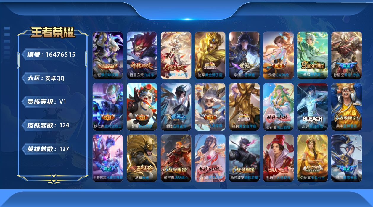 [16476515]可二次【特价出售/店主推荐】发育路35段 安卓Q-V0-永恒钻石I段位-127英雄-324皮肤-1典藏皮肤-13传说-96史诗