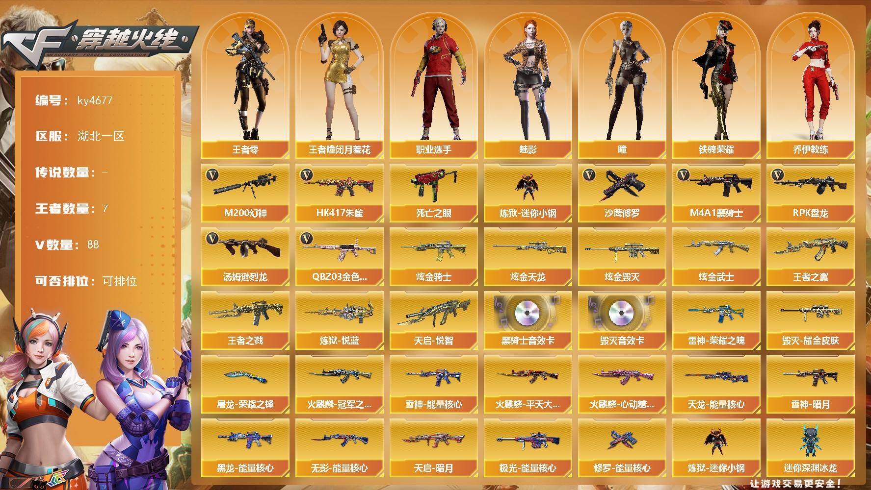 [16476847]湖北一区-88V-7王者-4炫金 【热门武器】:QBZ03-金色蔷薇,HK417-朱雀,M200-幻神,死亡之眼,炼狱-迷你小钢,M4A1-黑骑士*3,汤姆逊-烈龙*5,RPK-盘龙,沙鹰-修罗*10 【王者炫金武器】:王者之戮,天启-悦智,王者之翼,炼狱-悦蓝,炫金骑士,炫金武士,炫金毁灭,炫金天龙 【音效卡】:M4A1-黑骑士音效卡,Barrett-毁灭音效卡 【皮肤】:雷神-暗月,雷神-能量核心,雷神-荣耀之魄,火麒麟-冠军之心,火麒麟-平天大圣,火麒麟-心动糖果,毁灭耀金皮肤*2,黑龙-能量核心,无影-能量核心,天启-暗月,天龙-能量核心,极光-能量核心,修罗-能量核心*2,屠龙-荣耀之锋 【角色】:瞳,魅影,王者-瞳-闭月羞花,王者-零,乔伊教练,空,飞虎队-X,风暴女,嘉年华灵狐,灵狐者-黄金海岸,麻雀,曼陀罗-X,潘多拉-X,斯沃特-X,铁骑-乘风破浪,铁骑荣耀,兔囡囡,新娜塔莎,影武者-X,职业选手 【人偶武器】:火麒麟-灵狐,炼狱-迷你小钢,AWM-灵狐-15周年嘉年华,COP-旗袍,迷你深渊冰龙,夺魂,迷你生化手雷 【暴走生化】:死亡之眼,超级对讲机 【挑战大师】:神圣爆裂者III,激光毁灭者III-白马银枪,神圣爆裂者-末日III 【英雄级武器】:M4A1-千变,AK47-火麒麟*5,AK47-麒麟,M4A1-黑龙,M4A1-雷神*2,M4A1-黑骑士*3,AK47-无影*2,AK47-黑武士,AK12-天启,M4A1-武圣,AK47-机械迷城*2,AK47-黑鲨,HK417-朱雀,无影-神兵利器,黑武士-锦绣游龙,M4A1-玫瑰精灵,QBZ03-金色蔷薇,M4A1-猎神,烈火-动感闪耀,王者之武-觉醒版,王者之魄-觉醒版,王者之幻-觉醒版,AK-47-猩红传说,AWM-天龙*6,Barrett-毁灭*4,Barrett-极光,AWM-裁决,M200-幻神,Barrett-金色蔷薇,RPK-盘龙,汤姆逊-烈龙*5,AA-12-雷霆,沙鹰-修罗*10,沙鹰-天神*3,Glock18-武圣,天神-动感闪耀,屠龙*3,龙啸,擎天*2,麒麟刺*2,屠龙-动感闪耀,高爆手雷-雷霆,手雷-动感闪耀,高爆手雷-云龙,闪光弹-雷霆,闪光弹-云龙,烟雾弹-雷霆,烟雾弹-云龙*2 【道具】:XROCK炫彩背包,战舰背包,炫彩背包,黄金生化钩,绿色巨人,灵魂忍者,