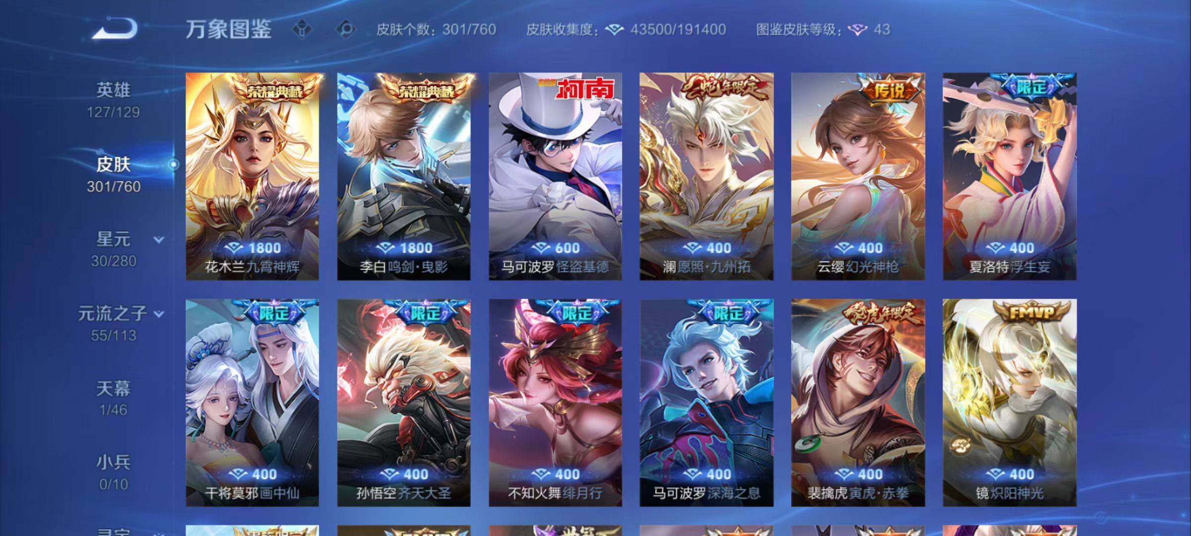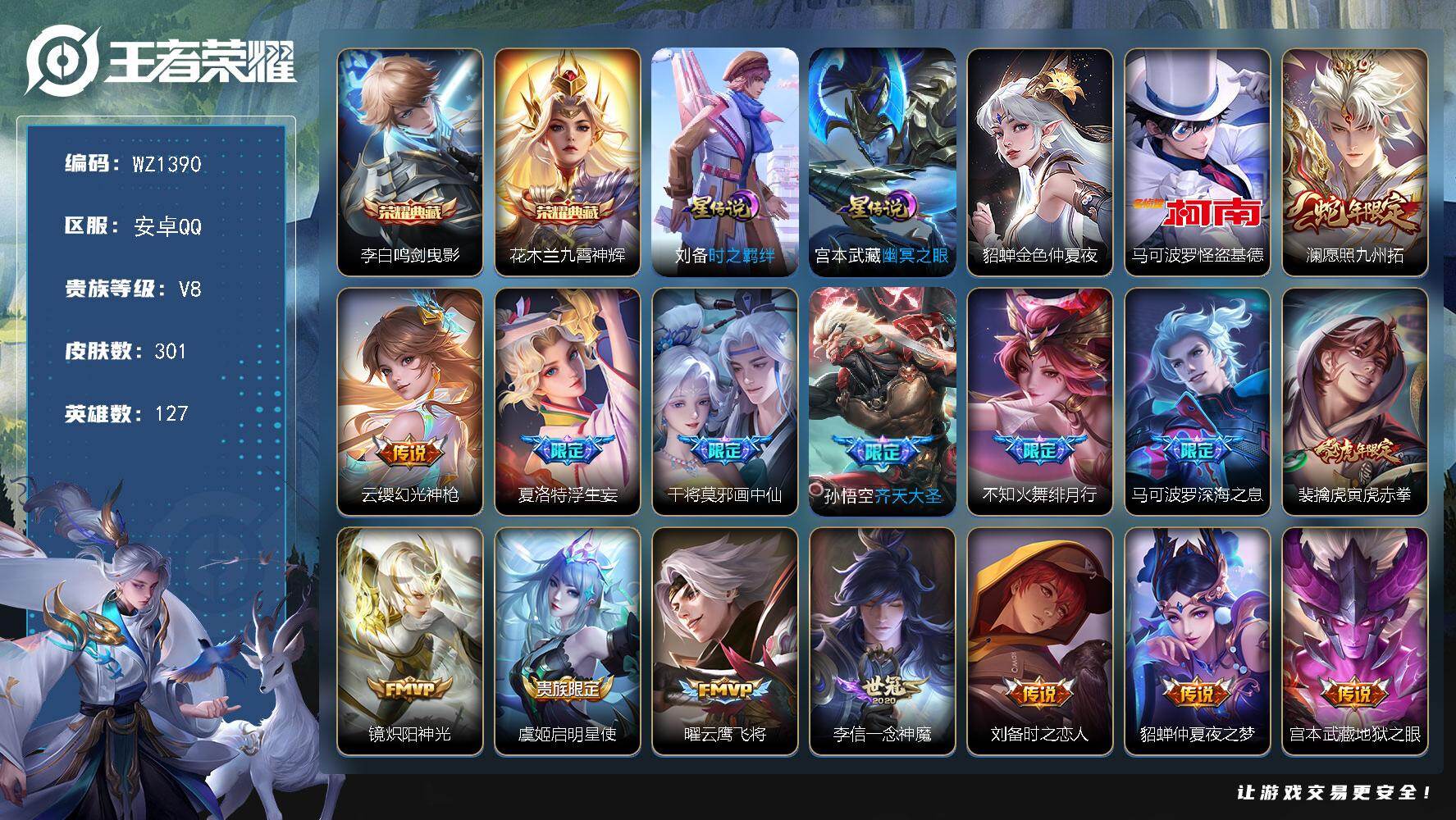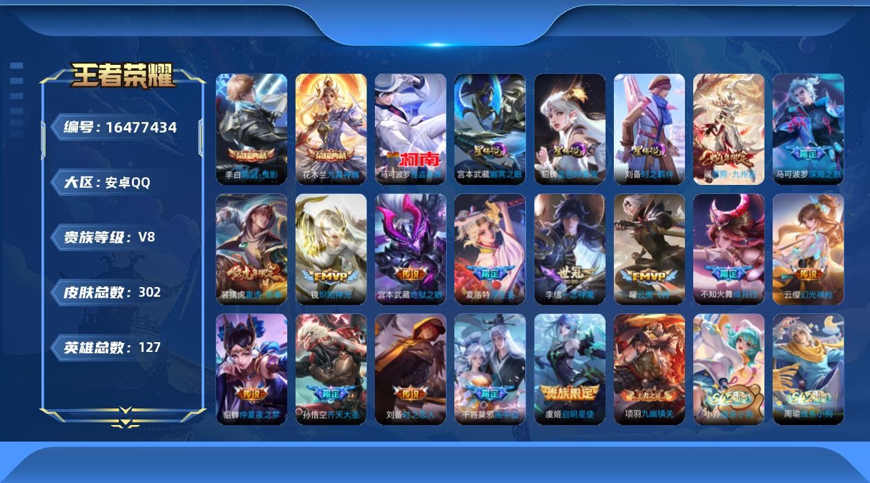 [16477434]安卓Q-V8-至尊星耀IV段位-127英雄-301皮肤-2典藏皮肤-1珍品传说-15传说-82史诗