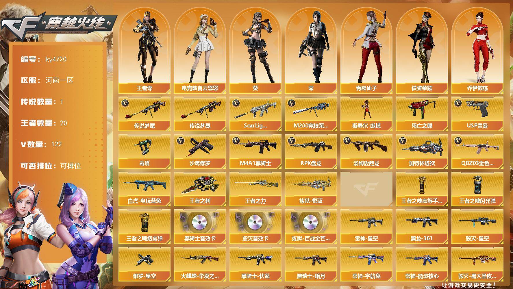 [16477867]河南一区-122V-20王者-0炫金 【传说武器】:传说梦魇 【热门武器】:传说梦魇,QBZ03-金色蔷薇,Scar Light-白虎,M200-竞技荣光,死亡之眼,白虎-电玩蓝兔,毒蜂,M4A1-黑骑士,汤姆逊-烈龙*4,RPK-盘龙*2,加特林-炼狱*3,斯泰尔-蝴蝶,USP-雷暴,沙鹰-修罗*4 【王者炫金武器】:王者星魄,王者之力,炼狱-悦蓝,王者之刺,王者之魄高爆手雷*2,王者之魄闪光弹,王者之魄烟雾弹 【音效卡】:M4A1-黑骑士音效卡,Barrett-毁灭音效卡*2,炼狱-百战金芒-庆典舞曲音效卡 【皮肤】:AWM-裁决-凤灵皮肤,裁决-胜者为王 皮肤,雷神-暗月,雷神-能量核心,雷神-星空,雷神-宇航兔皮肤,M4A1-再燃火线,火麒麟-华夏之心,火麒麟-平天大圣,火麒麟-心动糖果,毁灭-暗月*3,毁灭-星空,毁灭-黑大圣皮肤,毁灭-秦师 皮肤,毁灭-英雄计划 皮肤,黑龙-暗月,M4A1-黑龙-361,黑骑士-暗月,黑骑士-伏羲,无影-暗月,无影-能量核心,天启-紫霄 皮肤,战神-粉色甜心皮肤,战神-紫绶金章皮肤,战神-流金岁月皮肤,天龙-秘银*2,天龙-能量核心,极光-能量核心,加特林-炼狱-钟馗皮肤,修罗-能量核心*3,修罗-星空,修罗-百战金芒 皮肤,天神-暗月,屠龙-春桃 皮肤,屠龙-巅峰荣耀 皮肤,轻型军用手斧-再燃火线,龙啸-青青莓果 皮肤,麒麟刺-萌杀皮肤 【角色】:零,葵,电竞教官-云悠悠,王者-零,乔伊教练,修道士,暗夜-X,电竞少女,芳心审判者,风暴女*2,嘉年华灵狐,娟娟,兰-海滩派对,灵狐-花神,灵狐者-X,龙儿,龙儿-小淘气,曼陀罗-礼服,萌儿,潘多拉-X,潘多拉-甜心教官,潜龙队-X,青霞仙子,斯沃特-X,铁骑荣耀,兔囡囡,维纳斯,新娜塔莎,雪莉杨-摸金校尉,樱-战斗天使,影武者-X 【人偶武器】:火麒麟-灵狐,M4A1-雷神-精英刀锋,斯泰尔-蝴蝶,COP-旗袍,迷你牛魔王,深渊终结者手雷,闪光弹-小乔,迷你深渊冰龙-王绿豆,迷你艾比,迷你超能女侍,迷你巨石泰坦-魔花研究所 【暴走生化】:毒蜂,双面神,死亡之眼,超级对讲机 【英雄级武器】:M4A1-千变,AK47-火麒麟,M4A1-黑龙,M4A1-雷神,M4A1-黑骑士,AK47-无影,M4A1-死神,AK47-黑武士,AK12-天启,AN94-超新星,M4A1-武圣*