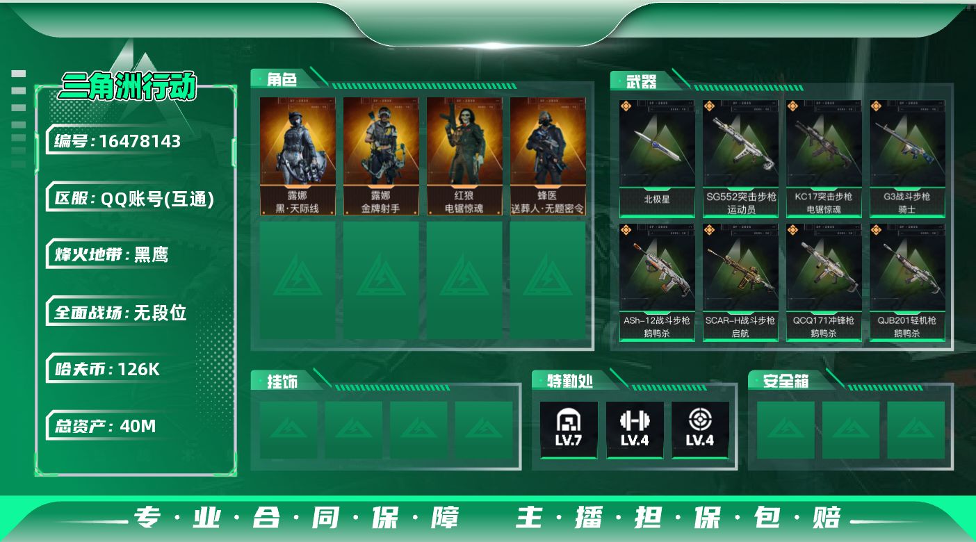 [16478143]可二次【店主推荐捡漏号!可直接换绑】40m总资产-126k哈伏币-60烽火等级-黑鹰-1战场等级-无军衔 【干员外观】:露娜-黑·天际线,蜂医-送葬人·无题密令,红狼-电锯惊魂,露娜-金牌射手 【近战皮肤】:近战-北极星,近战-黑鹰 【传说外观】:M4A1突击步枪-蚀金玫瑰,M4A1突击步枪-阿米娅,ASh-12战斗步枪-鹅鸭杀,SG552突击步枪-运动员,AK-12突击步枪-特斯拉线圈,SCAR-H战斗步枪-启航,G3战斗步枪-骑士,CAR-15突击步枪-阿米娅,腾龙突击步枪-捞点薯条,K437突击步枪-北极星,KC17突击步枪-电锯惊魂,Vector冲锋枪-能天使-午夜邮差,UZI冲锋枪-特斯拉线圈,SR-3M紧凑突击步枪-特斯拉线圈,勇士冲锋枪-能天使-午夜邮差,QCQ171冲锋枪-北极星,QCQ171冲锋枪-鹅鸭杀,725双管霰弹枪-送葬人-无题密令,M250通用机枪-骑士之心,QJB201轻机枪-鹅鸭杀,AWM狙击步枪-捞点薯条,93R-捞点薯条,复合弓-黑·天际线 【史诗外观】:ASh-12战斗步枪-无极限,M16A4突击步枪-竞赛选手,AUG突击步枪-蝮蛇,M7战斗步枪-百步穿杨,SCAR-H战斗步枪-囚徒,G3战斗步枪-流沙送葬,AS Val突击步枪-百步穿杨,腾龙突击步枪-无垢,K437突击步枪-守护者,MP5冲锋枪-战术竞备,MP5冲锋枪-竞技风,Vector冲锋枪-猎鳄行动,Vector冲锋枪-百步穿杨,SR-3M紧凑突击步枪-荒野求生,SR-3M紧凑突击步枪-战术竞备,勇士冲锋枪-工业狂潮,MP7冲锋枪-无垢,MP7冲锋枪-守护者,PKM通用机枪-荒野求生,M250通用机枪-囚徒,Mini-14射手步枪-守护者,SVD狙击步枪-荒野求生,PSG-1射手步枪-无垢,SV-98狙击步枪-林中猎手,SV-98狙击步枪-囚徒,SV-98狙击步枪-猎鳄行动,M700狙击步枪-竞技风,M700狙击步枪-百步穿杨,AWM狙击步枪-无极限,AWM狙击步枪-流沙送葬,复合弓-守护者 【稀有外观】:As Val突击步枪-星之彩,M4A1突击步枪-繁盛,AKM突击步枪-战术演练,AKM突击步枪-肃杀,QBZ95-1突击步枪-公平竞技,ASh-12战斗步枪-繁盛,K416突击步枪-虎啸,AUG突击步枪-精英联盟,M7战斗步枪-捣蛋鬼,SCAR-H战斗步枪-荣耀列队