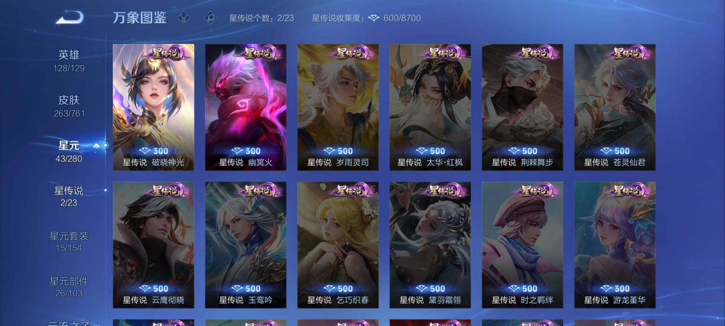 明世隐疑决卦,老夫子醍醐杖,鬼谷子原初探秘者,狄仁杰万华元夜,程咬金演武夺筹,钟馗驱傩正仪,苏烈千军破阵,吕布猎兽之王,李元芳银河之约,马可波罗暗影游猎,元歌云间偶戏,达摩沙漠行僧,兰陵王金庭之子,沈梦溪大漠名商,李元芳云中旅人,桑启海盐诗旅,裴擒虎擒涛扼浪,鲁班大师探海日志,张良古海寻踪,项羽苍威无极,镜青焰无极