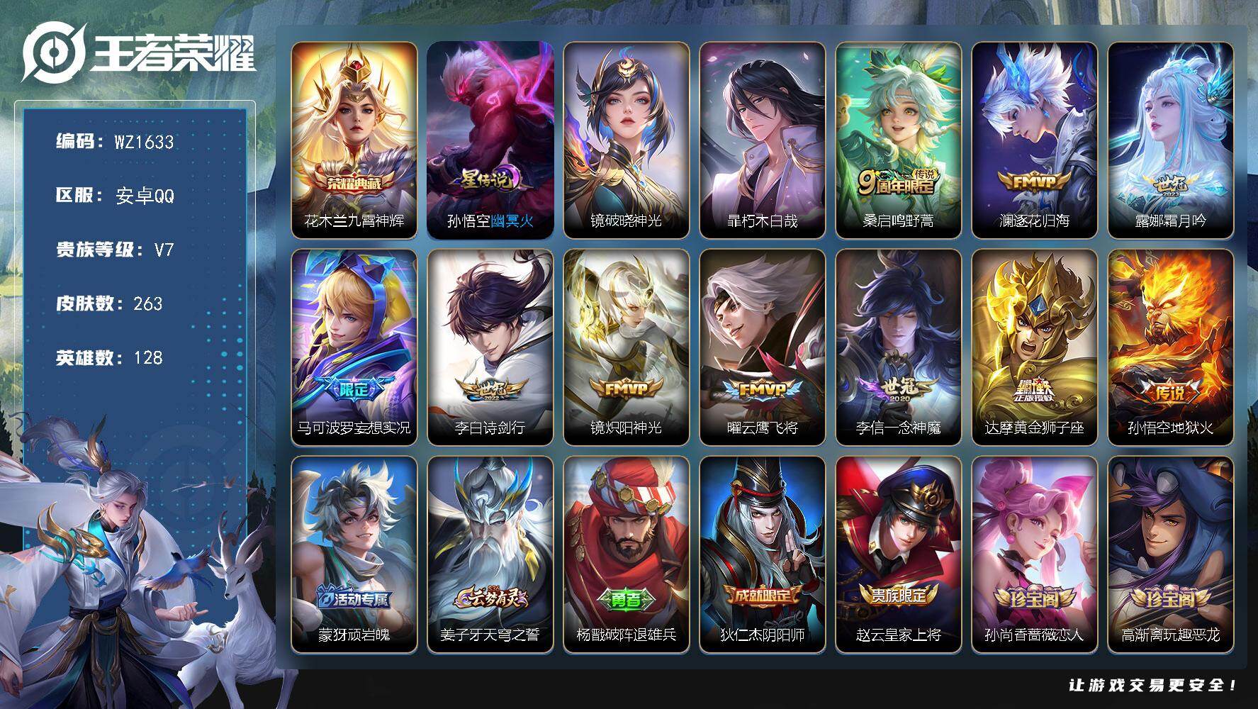- [16397957]【特价出售/店主推荐安卓,打野20段】安卓Q-V10-永恒钻石III段位-129英雄-506皮肤-3典藏皮肤-6星传说-1典藏英雄-2无双-7珍品传说-53传说-157史诗 【英雄全皮】:阿轲全皮,夏侯惇全皮,达摩全皮,刘邦全皮,孙权全皮,橘右京全皮,钟馗全皮,苍全皮,雅典娜全皮,苏烈全皮,狂铁全皮,李信全皮,盾山全皮,嫦娥全皮,蒙恬全皮,司空震全皮,戈娅全皮,空空儿全皮,影全皮 【荣耀典藏】:武则天英雄,夏侯惇无限飓风号,花木兰九霄神辉,铠银白咏叹调 【无双皮肤】:甄姬雪境奇遇,曜器灵螭龙剑 【珍品传说】:马可波罗怪盗基德,鲁班七号江户川柯南,孙策时之奇旅,嫦娥器灵落星盏,张飞兔狲蓬尾,瑶大耳狗之梦,安琪拉酷洛米之心 【传说皮肤】:后羿神树通天,杨玉环星之鸣奏,后羿千劫归真,司空震愿照山河定,女娲愿照千秋盛,妲己愿照众生和,澜愿照九州拓,蔡文姬愿照福禄聚,虞姬愿照岁时盈,云缨幻光神枪,嬴政玄雷天君,王昭君映山客,桑启鸣野蒿,夏侯惇霜北刀,铠冥王哈迪斯,铠琥珀纪元,艾琳觅芳踪,诸葛亮鹤羽星尊,张飞百相守梦,夏洛特浮生妄,干将莫邪画中仙,虞姬无限倾心,项羽无限倾心,伽罗炽翼辉光,孙悟空齐天大圣,李信山海炽霜斩,吕布怒海麟威,李白诗剑行,不知火舞绯月行,百里守约碎云,橘右京枫霜尽,大乔挚爱花嫁,孙策挚爱之约,露娜启示之音,貂蝉遇见胡旋,公孙离祈雪灵祝,诸葛亮时雨天司,铠绛天战甲,镜炽阳神光,虞姬启明星使,关羽武圣,李信一念神魔,张良黄金白羊座,达摩黄金狮子座,花木兰冠军飞将,后羿黄金射手座,诸葛亮武陵仙君,貂蝉仲夏夜之梦,孙尚香末日机甲,宫本武藏地狱之眼,孙悟空地狱火,吕布天魔缭乱,武则天海洋之心 【限定皮肤】:白起狰,夏侯惇霜北刀,铠冥王哈迪斯,蒙犽顽岩魄,蔡文姬夏日便利店,大乔绒语心约,虞姬夏日便利店,姜子牙天穹之誓,杨戬破阵退雄兵,李白谪仙醉月,狄仁杰阴阳师,虞姬凯尔特女王,赵云皇家上将,赵云引擎之心,赵云龙胆,赵云百木心枪,墨子神迹守卫,妲己热情桑巴,嬴政白昼王子,孙尚香蔷薇恋人,鲁班七号狮舞东方,庄周云端筑梦师,庄周高山流水,高渐离玩趣恶龙,阿轲迷踪丽影,钟无艳王者之锤,钟无艳超时空战士,白起夜都怪侠,芈月重明,芈月白晶晶,芈月幻夜卜梦,吕布天魔缭乱,吕布猎兽之王,吕布御风骁将,元歌云间偶戏,元歌无心,夏侯惇朔风刀,夏侯惇匿光决锋者,甄姬游园惊梦,甄姬落雪兰