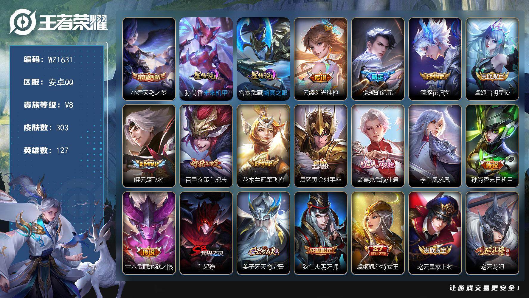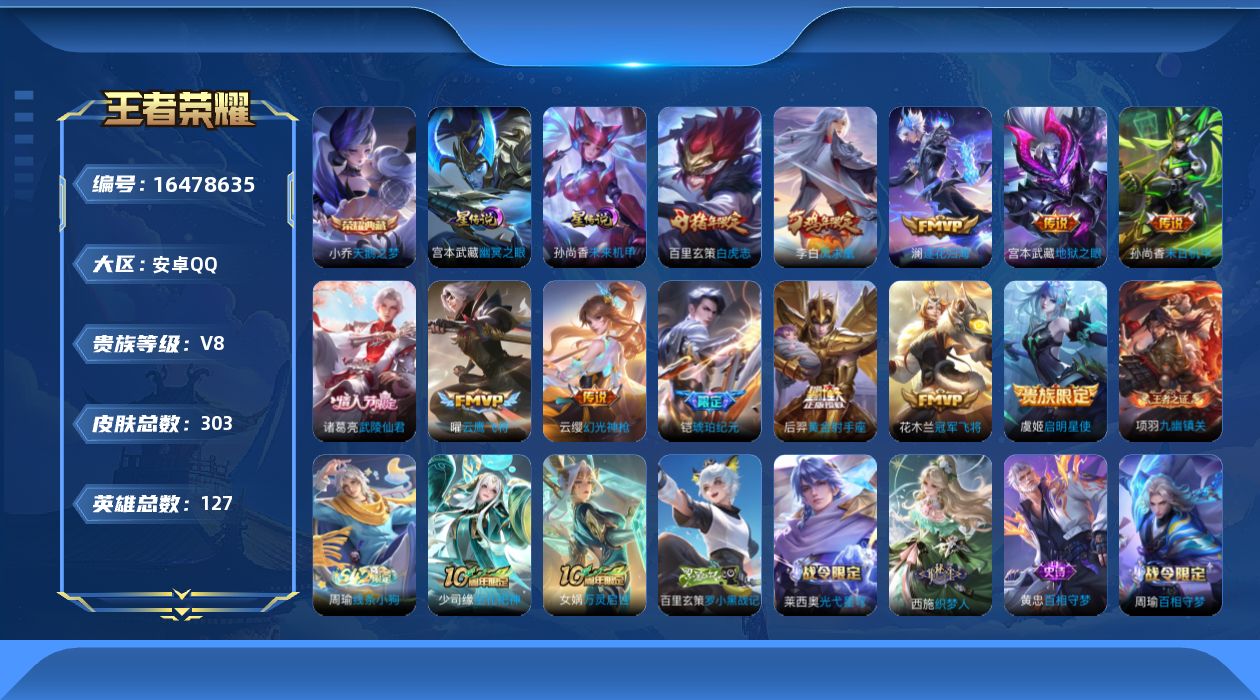 [16478635]安卓Q-V8-至尊星耀IV段位-127英雄-303皮肤-1典藏皮肤-12传说-86史诗