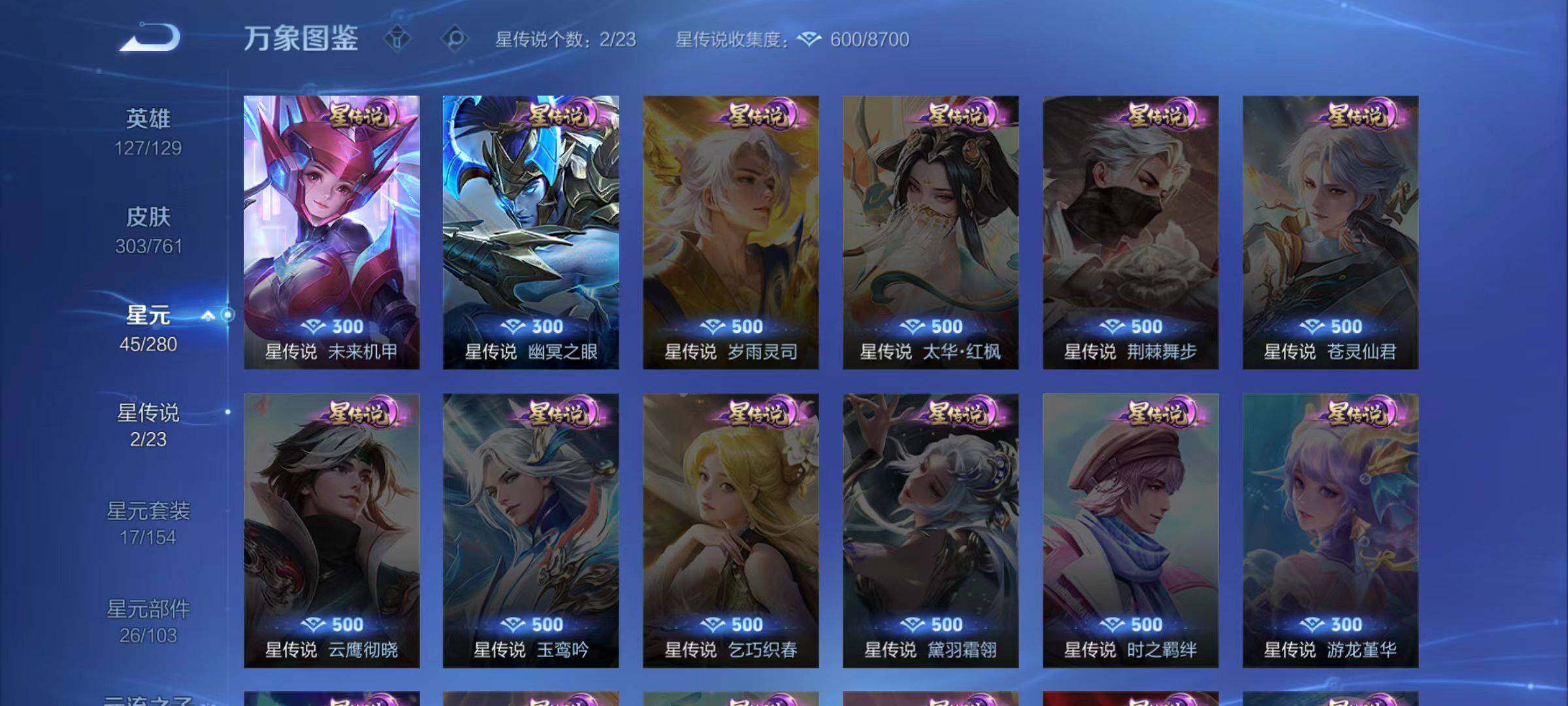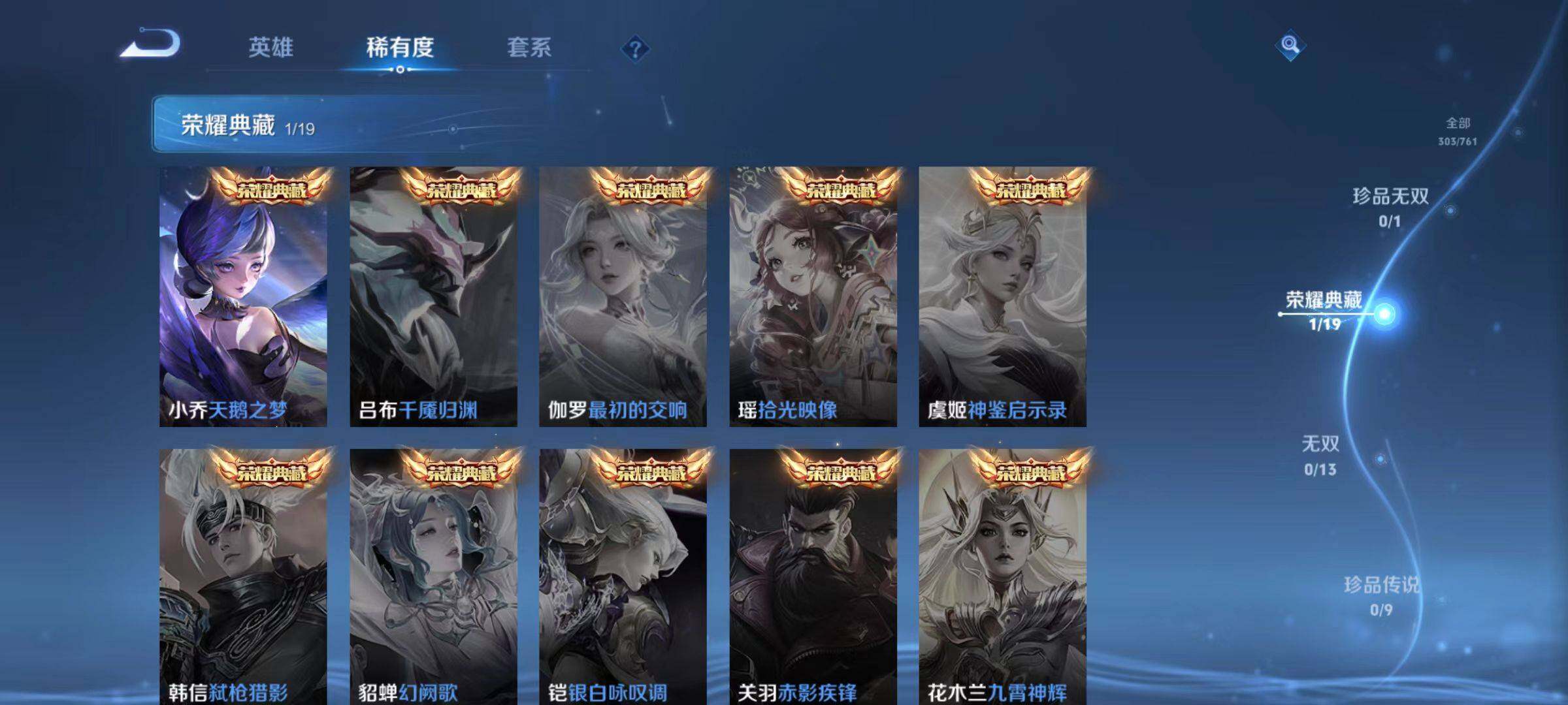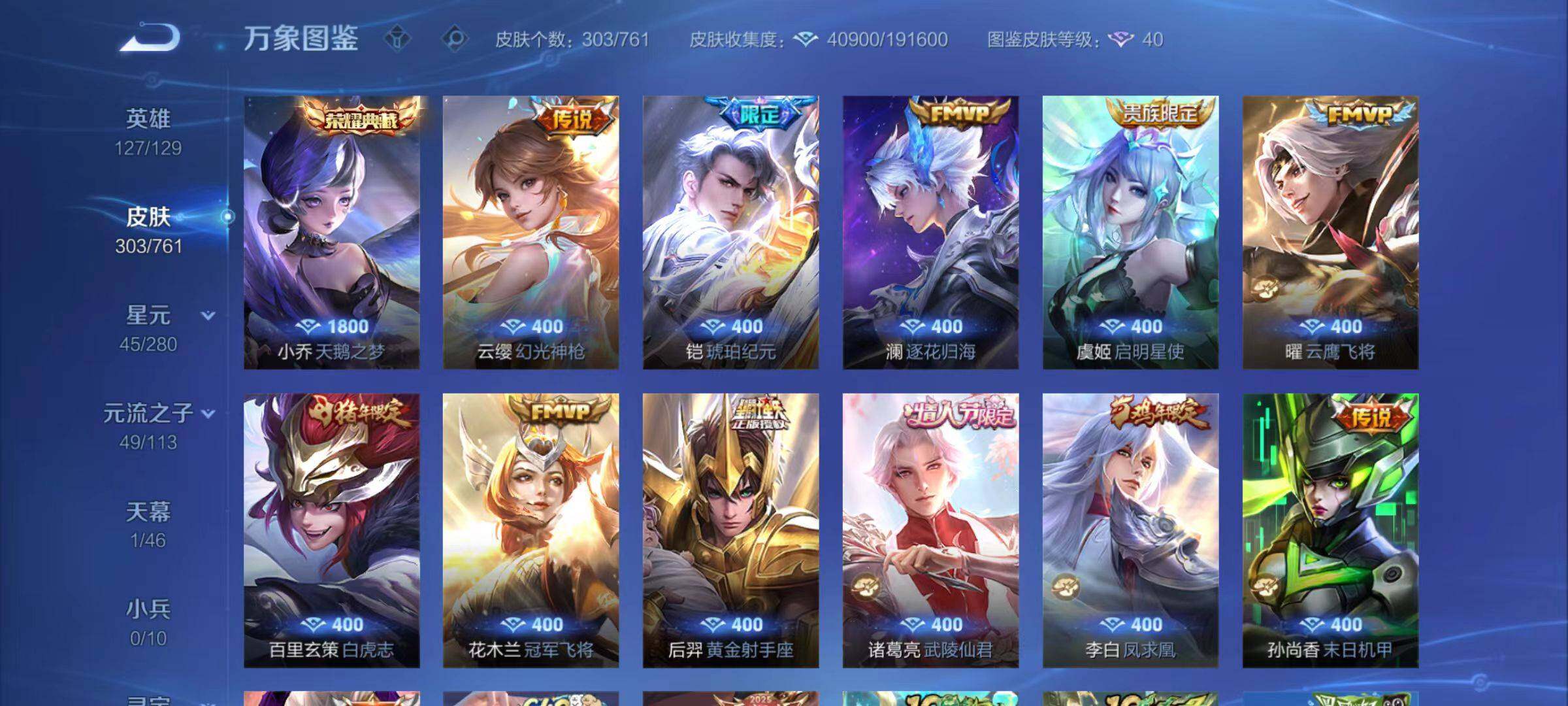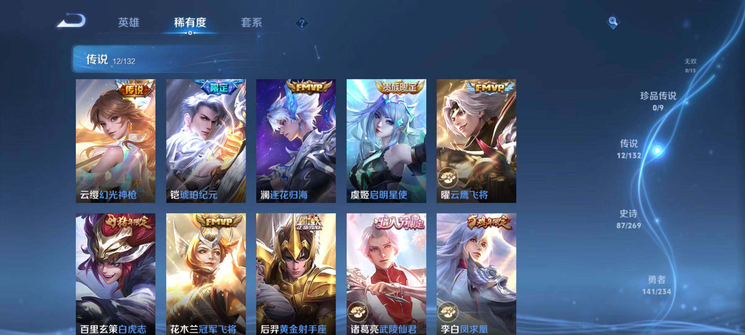 【传说皮肤】:云缨幻光神枪,铠琥珀纪元,澜逐花归海,虞姬启明星使,曜云鹰飞将,百里玄策白虎志,花木兰冠军飞将,后羿黄金射手座,诸葛亮武陵仙君,李白凤求凰,孙尚香末日机甲,宫本武藏地狱之眼