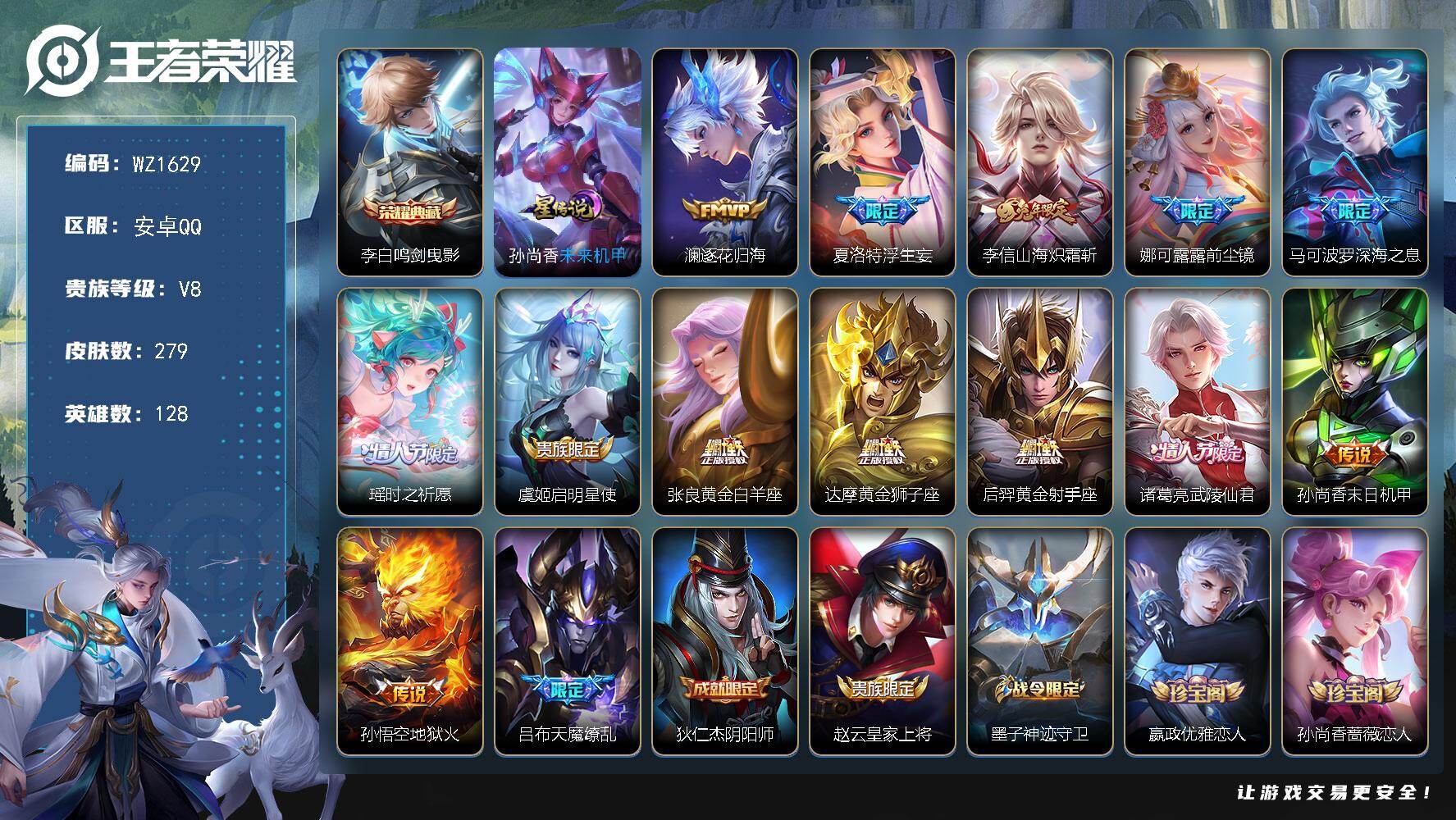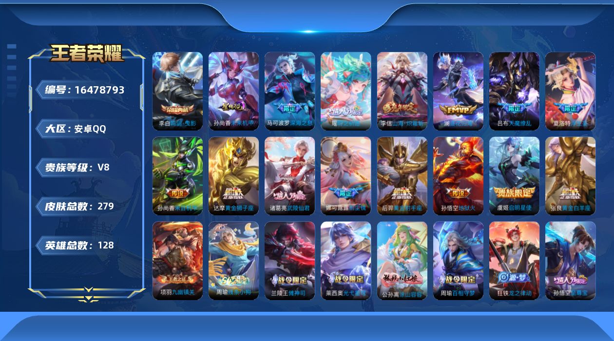 [16478793]安卓Q-V8-最强王者段位-128英雄-279皮肤-1典藏皮肤-14传说-84史诗