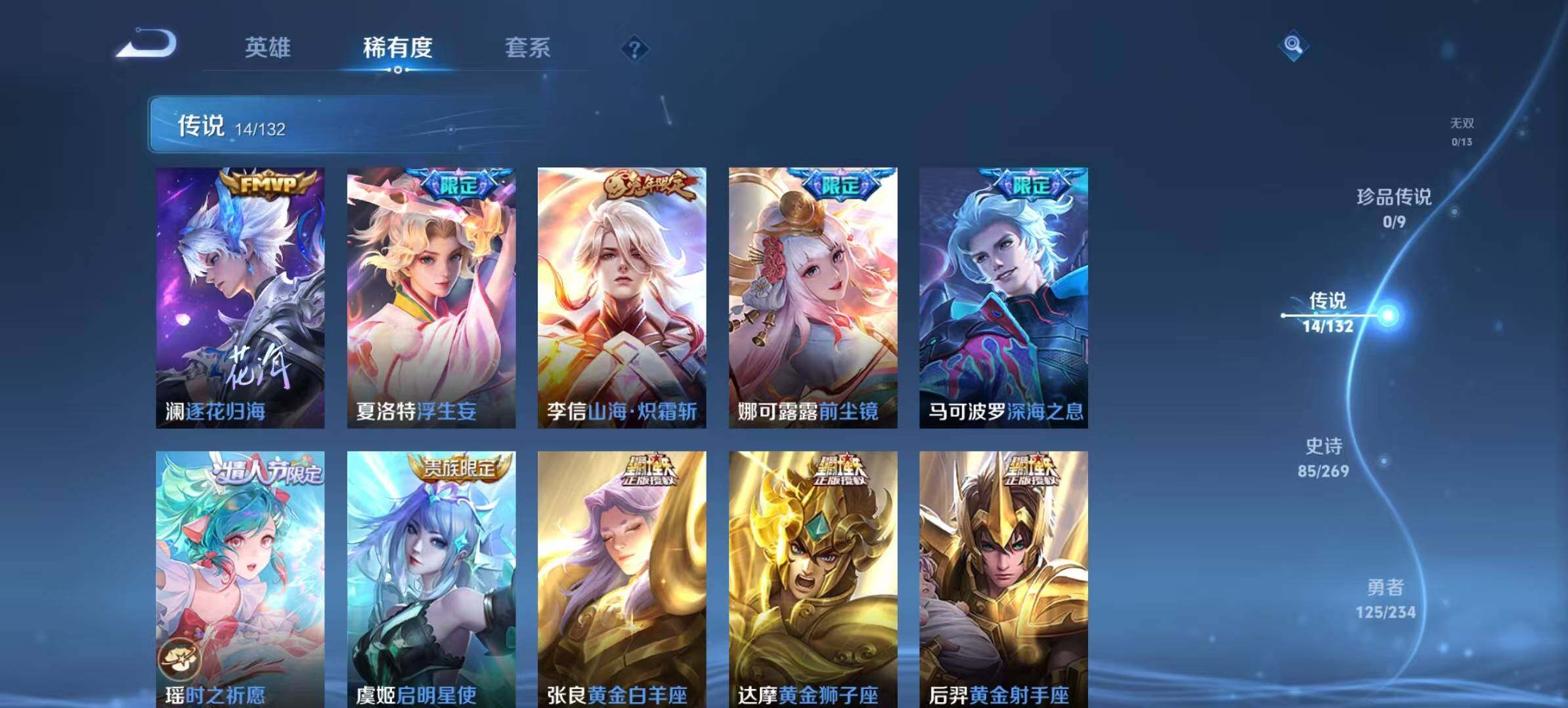 【传说皮肤】:澜逐花归海,夏洛特浮生妄,李信山海炽霜斩,娜可露露前尘镜,马可波罗深海之息,瑶时之祈愿,虞姬启明星使,张良黄金白羊座,达摩黄金狮子座,后羿黄金射手座,诸葛亮武陵仙君,孙尚香末日机甲,孙悟空地狱火,吕布天魔缭乱