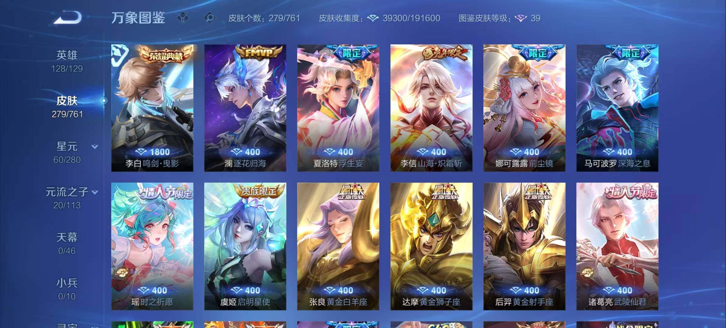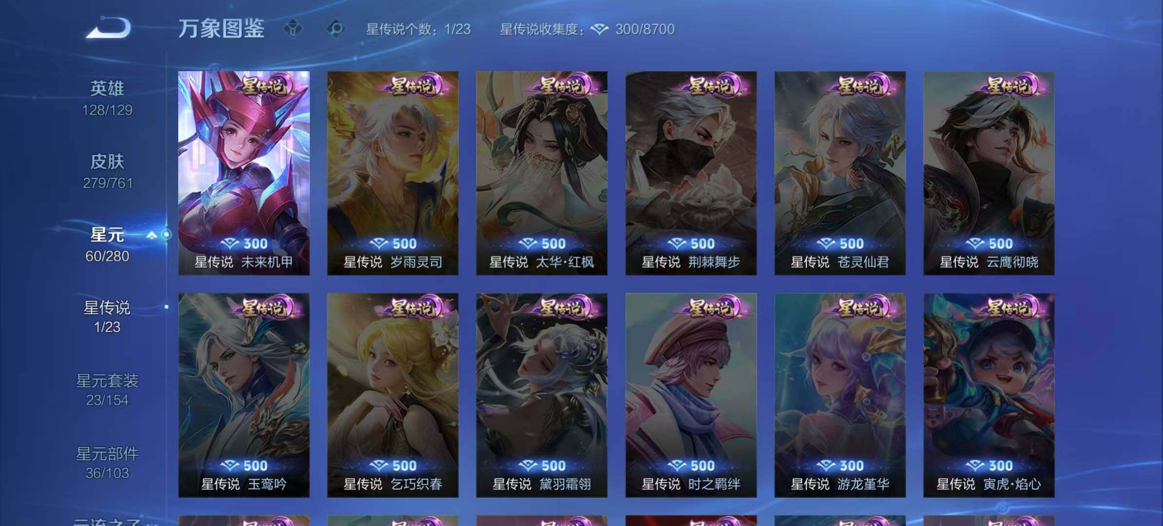 夏侯惇朔风刀,明世隐疑决卦,老夫子醍醐杖,鬼谷子原初探秘者,狄仁杰万华元夜,程咬金演武夺筹,钟馗驱傩正仪,苏烈千军破阵,鲁班七号狮舞东方,沈梦溪星空之诺,李元芳银河之约,刘邦夺宝奇兵,马可波罗暗影游猎,蒙犽狂想玩偶喵,元歌云间偶戏,弈星混沌棋,达摩沙漠行僧,兰陵王金庭之子,沈梦溪大漠名商,李元芳云中旅人,桑启海盐诗旅,裴擒虎擒涛扼浪,镜青焰无极