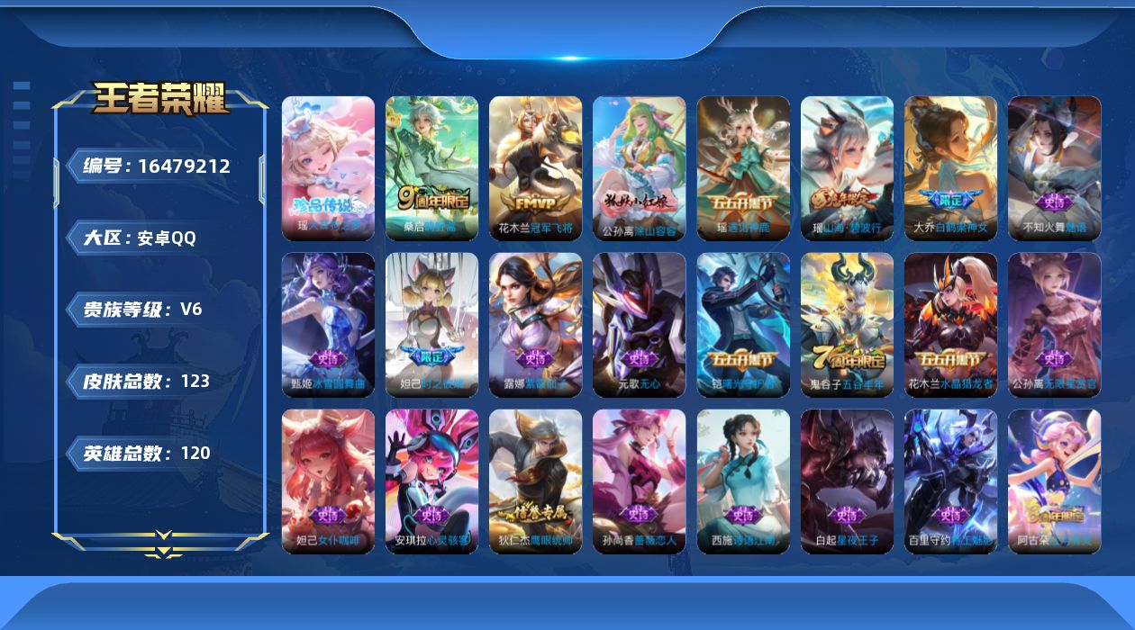 [16479212]安卓Q-V2-荣耀黄金I段位-120英雄-123皮肤-1珍品传说-2传说-42史诗