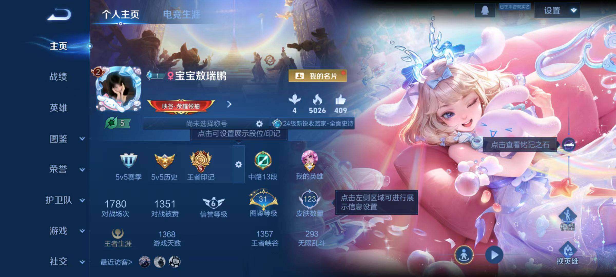 - [12316763]V10 11典藏 53传说 124英雄 454皮肤 典藏英雄武则天 可修改实名 司马懿小国标优质装备:天鹅之梦(小乔典藏),星空梦想(太空人),倪克斯神谕(宇宙婆娘),无限飓风号(高达),活力突击,杀手不太冷,大秦宣太后,鸣剑·曳影,全息碎影(猴子典藏),星域神启(倪克斯贼亮),弑枪猎影(韩信典藏),黄金狮子座,黄金射手座,冠军飞将,云鹰飞将(小将军),绛天战甲(鸡嘴战神),黄金白羊座,猫影幻舞,久胜战神,炽阳神光,一念神魔,云霓雀翎,末日机甲-孙尚香(绿蚂蚱),地狱火,仲夏夜之梦(大飞蛾),音你心动-小乔,零号·赤焰,海洋之心,地狱之眼,音你心动-周瑜,胖达荣荣,李逍遥,乞巧织情,时之恋人-刘备(电焊工),游龙清影(小青龙),淬星耀世,超时空战士-狄仁杰,无双飞将,碎云,浮生妄,记忆之芯(机甲兔),追逃游戏(亚瑟),电玩·雷克斯,鹤羽星尊,妄想实况,妄想奇谈,澜逐花归海,艾琳觅芳踪 传说皮:乘龙·铭钟鼎(赵云年限) 珍宝阁皮:优雅恋人,蔷薇恋人,女武神 限定皮:至尊宝,白虎志(电光耗子),凤求凰(白切鸡),凤凰于飞,太华(伽罗年限),梅西,武陵仙君(小桃花),异界灵契(白毛香),傲雪梅枪,补天,前尘镜,时之彼端,白鹤梁神女,魔法小厨娘,白晶晶,时雨天司(水龙头),神威(电光马子),飞衡(韩信年限),玄嵩(庄周年限),瑞麟志(木兰年限),遇见飞天,高山流水,五谷丰年,青龙志(铠年限),冰锋战神,幽恒(沐浴露),武圣,天狼运算者,游园惊梦,梁祝,御风骁将(吕布年限),天狼狩猎者,龙胆,逐梦之星,烈魂,岱宗(典韦年限),天狼溯光者,虎魄,天狼征服者,奔雷神使(牛魔年限),祈雪灵祝(雪兔子),天狼绘梦者,李小龙,逐梦之影,逐梦之光,玄武志(苏烈年限),朱雀志(守约年限),永曜之星,辉光之辰,如梦令-嫦娥,如梦令-后羿,霸王别姬-项羽,霸王别姬-虞姬,奇迹圣诞,默契交锋-兰陵王,默契交锋-花木兰,孙行者,猪悟能,一生所爱,大圣娶亲,引擎之心,天魔缭乱,冰霜恋舞曲,云端筑梦师,乒乒小将,蜜橘之夏,神奇女侠,百木心枪,玉兔公主,深海之息(深海大菠萝) 史诗皮:灵蛊蚀心,琥珀纪元伽罗,遇见神鹿,紫霞仙子,苍穹之光,电玩小子(小书包),白龙吟,黄金分割率,特工魅影,千年之狐,永昼,匿光侦查者,真我赫兹(镜),真我赫兹(百里守约),魅语,百解令(蒙犽),高渐离燃音魔法,蒙恬荣光圣徽