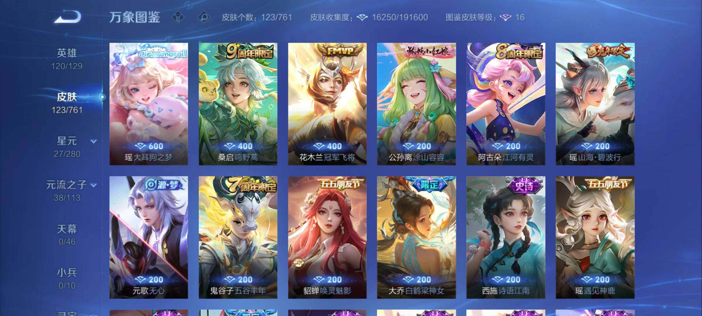 瑶遇见神鹿,李元芳逐浪之夏,不知火舞魅语,公孙离无限星赏官,大乔猫狗日记,孙策猫狗日记,阿轲节奏热浪,露娜紫霞仙子,王昭君偶像歌手,白起星夜王子,安琪拉心灵骇客,刘邦德古拉伯爵,兰陵王暗隐猎兽者,宫本武藏鬼剑武藏,亚瑟心灵战警,蔡文姬舞动绿茵,廉颇地狱岩魂,西施诗语江南,小乔缤纷独角兽,花木兰水晶猎龙者,铠曙光守护者,吕布圣诞狂欢,貂蝉圣诞恋歌,百里守约特工魅影,貂蝉唤灵魅影