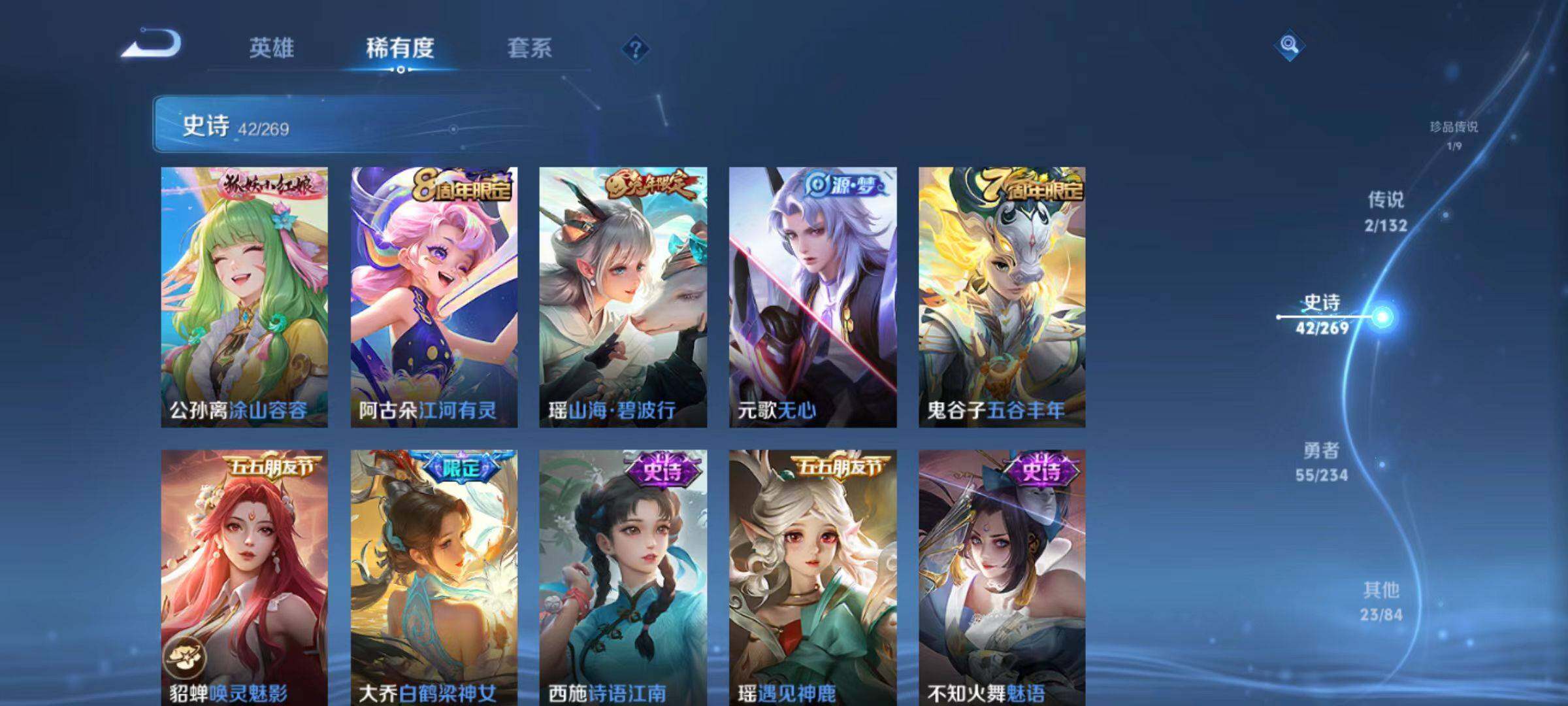 【史诗皮肤】:露娜紫霞仙子,赵云皇家上将,赵云未来纪元,貂蝉圣诞恋歌,甄姬冰雪圆舞曲,王昭君偶像歌手,狄仁杰魔术师,廉颇地狱岩魂,宫本武藏鬼剑武藏,孙尚香蔷薇恋人,孙尚香水果甜心,妲己魅力维加斯,妲己女仆咖啡,吕布圣诞狂欢,花木兰水晶猎龙者,刘邦德古拉伯爵,小乔缤纷独角兽,兰陵王暗隐猎兽者,甄姬游园惊梦,亚瑟心灵战警,安琪拉心灵骇客,百里守约特工魅影,铠曙光守护者,蔡文姬舞动绿茵,李元芳逐浪之夏,白起星夜王子,阿轲节奏热浪,孙策猫狗日记,大乔猫狗日记,狄仁杰鹰眼统帅,公孙离无限星赏官,妲己时之彼端,不知火舞魅语,瑶遇见神鹿,西施诗语江南,大乔白鹤梁神女,貂蝉唤灵魅影,鬼谷子五谷丰年,元歌无心,瑶山海碧波行,阿古朵江河有灵,公孙离涂山容容