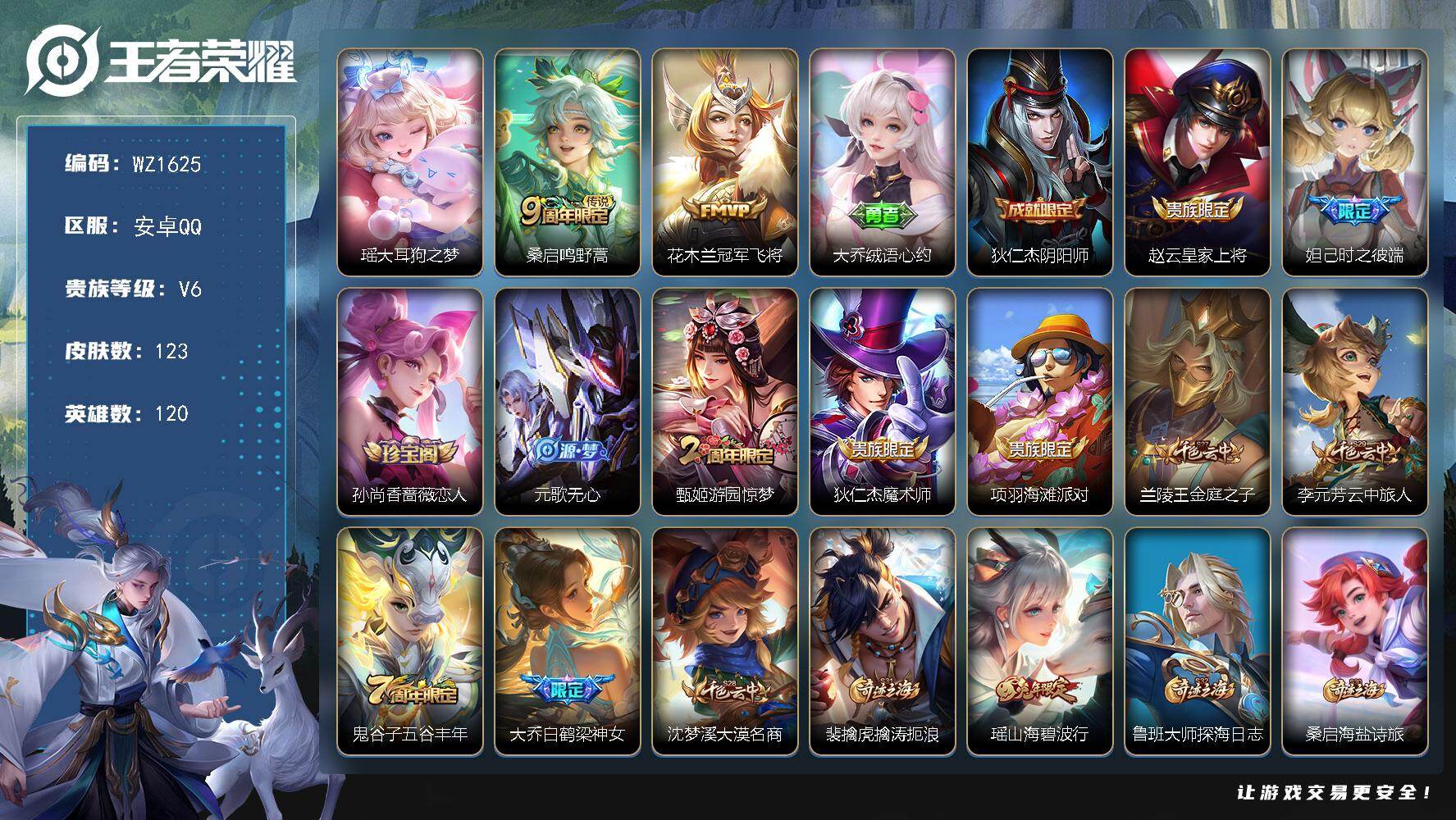 [16479212]安卓Q-V2-荣耀黄金I段位-120英雄-123皮肤-1珍品传说-2传说-42史诗 【珍品传说】:瑶大耳狗之梦 【传说皮肤】:桑启鸣野蒿,花木兰冠军飞将 【限定皮肤】:大乔绒语心约,狄仁杰阴阳师,赵云皇家上将,妲己时之彼端,孙尚香蔷薇恋人,元歌无心,甄姬游园惊梦,狄仁杰魔术师,项羽海滩派对,兰陵王金庭之子,李元芳云中旅人,鬼谷子五谷丰年,大乔白鹤梁神女,沈梦溪大漠名商,裴擒虎擒涛扼浪,瑶山海碧波行,鲁班大师探海日志,桑启海盐诗旅,艾琳女武神,阿古朵江河有灵,张良古海寻踪,鬼谷子天穹祈灯,刘邦剑破天穹,周瑜熔金海岸 【年限皮肤】:瑶山海碧波行 【赛季限定】:兰陵王金庭之子,沈梦溪大漠名商,李元芳云中旅人,桑启海盐诗旅,裴擒虎擒涛扼浪,鲁班大师探海日志,张良古海寻踪,鬼谷子天穹祈灯,刘邦剑破天穹,东皇太一噬灭天穹,太乙真人谧流熔炉,钟馗虚灵犬护,亚瑟荣光之誓 【史诗皮肤】:露娜紫霞仙子,赵云皇家上将,赵云未来纪元,貂蝉圣诞恋歌,甄姬冰雪圆舞曲,王昭君偶像歌手,狄仁杰魔术师,廉颇地狱岩魂,宫本武藏鬼剑武藏,孙尚香蔷薇恋人,孙尚香水果甜心,妲己魅力维加斯,妲己女仆咖啡,吕布圣诞狂欢,花木兰水晶猎龙者,刘邦德古拉伯爵,小乔缤纷独角兽,兰陵王暗隐猎兽者,甄姬游园惊梦,亚瑟心灵战警,安琪拉心灵骇客,百里守约特工魅影,铠曙光守护者,蔡文姬舞动绿茵,李元芳逐浪之夏,白起星夜王子,阿轲节奏热浪,孙策猫狗日记,大乔猫狗日记,狄仁杰鹰眼统帅,公孙离无限星赏官,妲己时之彼端,不知火舞魅语,瑶遇见神鹿,西施诗语江南,大乔白鹤梁神女,貂蝉唤灵魅影,鬼谷子五谷丰年,元歌无心,瑶山海碧波行,阿古朵江河有灵,公孙离涂山容容 【其他皮肤】:项羽海滩派对,韩信教廷特使,赵云白执事,艾琳女武神,牛魔西部大镖客,安琪拉玩偶对对碰,姜子牙时尚教父,典韦黄金武士,亚瑟死亡骑士,达摩拳王,花木兰兔女郎,甄姬花好人间,狄仁杰阴阳师,钟无艳海滩丽影,王昭君幻想奇妙夜,老夫子功夫老勺,孙尚香沉稳之力,李白敏锐之力,鬼谷子幻乐之宴,大乔守护之力,明世隐虹云星官,孙膑归虚梦演,沈梦溪鲨炮海盗猫,哪吒次元突破,鲁班七号黑桃队长,狂铁特工战影,刘禅秘密基地,鲁班大师乓乓大师,兰陵王金庭之子,沈梦溪大漠名商,蒙犽胡桃狂想曲,李元芳云中旅人,刘备潮玩造梦师,桑启海盐诗旅,赵怀真太极少年,裴擒虎擒涛扼浪,鲁班大师探海日志,李元芳妄想