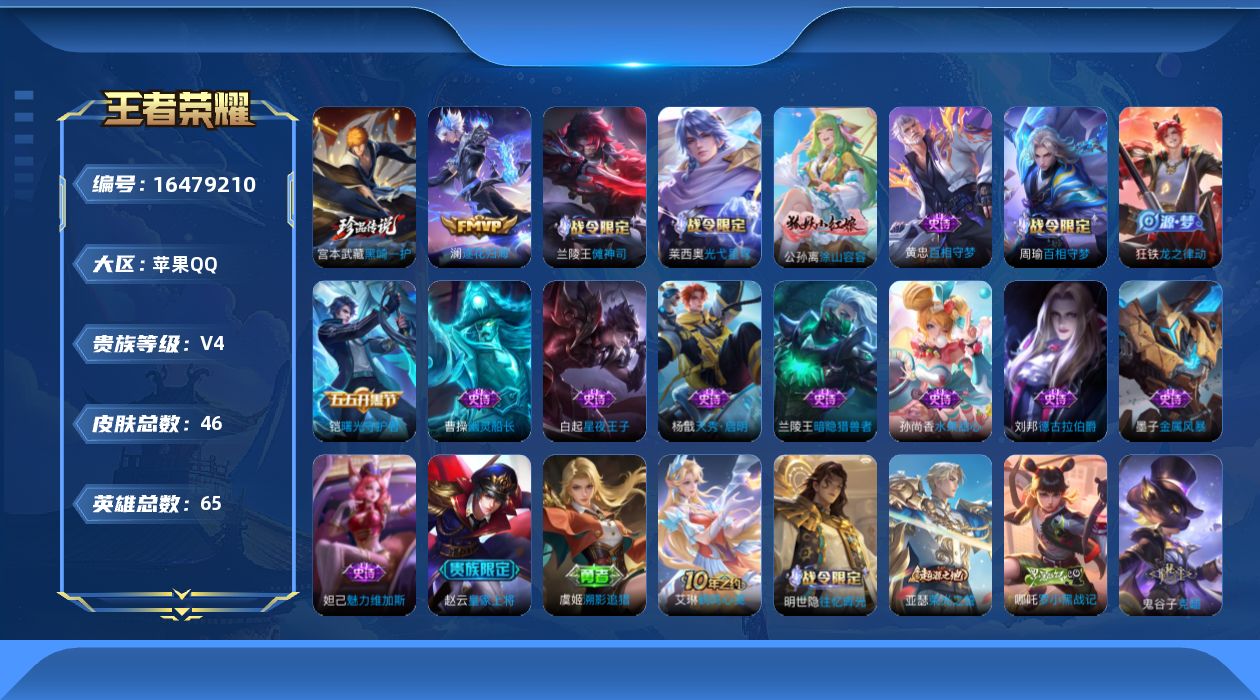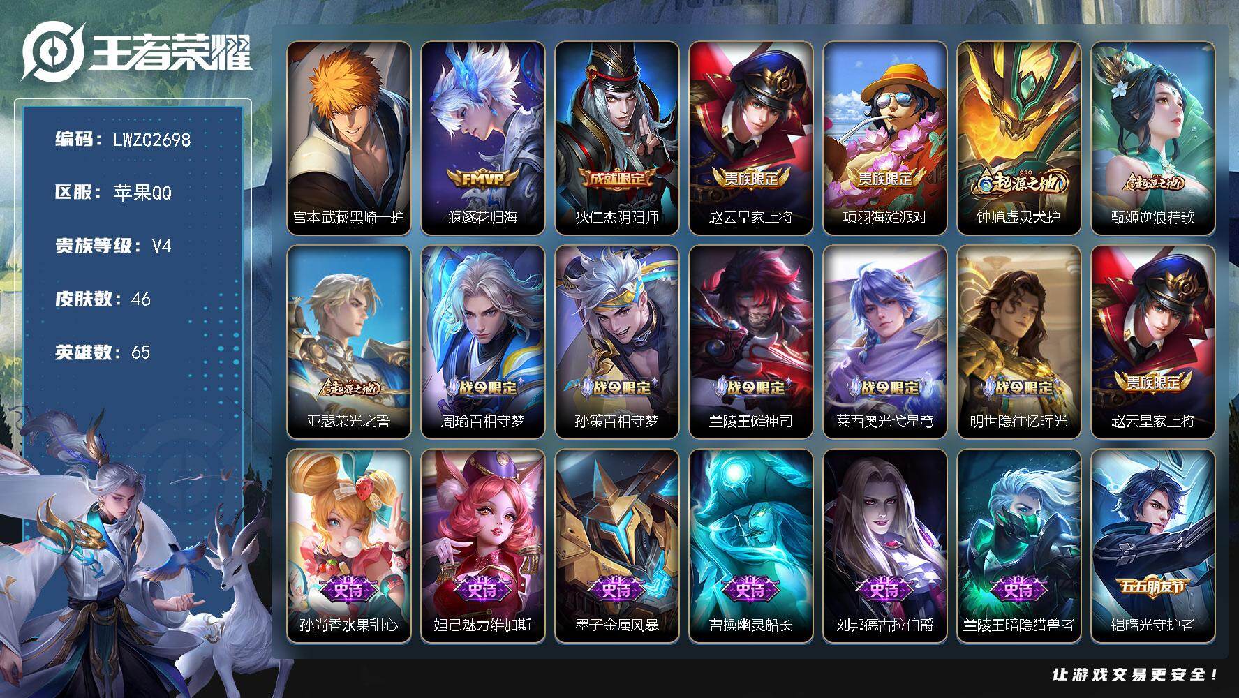 [16479210]【店主推荐捡漏号!可直接换绑】苹果Q-V4-至尊星耀IV段位-65英雄-46皮肤-1珍品传说-1传说-16史诗 【珍品传说】:宫本武藏黑崎一护 【传说皮肤】:澜逐花归海 【限定皮肤】:狄仁杰阴阳师,赵云皇家上将,项羽海滩派对 【赛季限定】:钟馗虚灵犬护,甄姬逆浪荇歌,亚瑟荣光之誓 【战令限定】:周瑜百相守梦,孙策百相守梦,兰陵王傩神司,莱西奥光弋星穹,明世隐往忆晖光 【史诗皮肤】:赵云皇家上将,孙尚香水果甜心,妲己魅力维加斯,墨子金属风暴,曹操幽灵船长,刘邦德古拉伯爵,兰陵王暗隐猎兽者,铠曙光守护者,白起星夜王子,杨戬天秀启明,狂铁龙之律动,周瑜百相守梦,黄忠百相守梦,公孙离涂山容容,莱西奥光弋星穹,兰陵王傩神司 【其他皮肤】:项羽海滩派对,达摩大发明家,赵云忍炎影,牛魔西部大镖客,亚瑟死亡骑士,达摩拳王,甄姬花好人间,狄仁杰阴阳师,马可波罗潮玩牛仔,钟馗虚灵犬护,白起死霸装,甄姬逆浪荇歌,孙策百相守梦,庄周锦麟游梦,莱西奥踏浪烽翎,鬼谷子克喵,哪吒罗小黑战记,亚瑟荣光之誓,明世隐往忆晖光,艾琳鹤鸣心笺,虞姬溯影追猎,后羿精灵王,杨戬埃及法老,女娲尼罗河女神,裴擒虎街头旋风,司马懿魇语军师,马超幸存者,司空震启蛰 【营地ID】:1632648500
