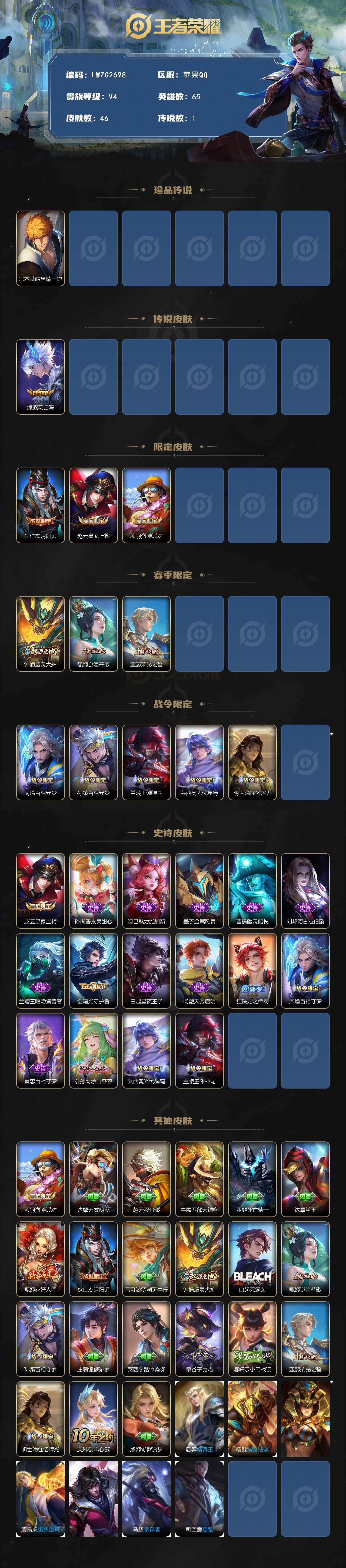 [16479210]【店主推荐捡漏号!可直接换绑】苹果Q-V4-至尊星耀IV段位-65英雄-46皮肤-1珍品传说-1传说-16史诗