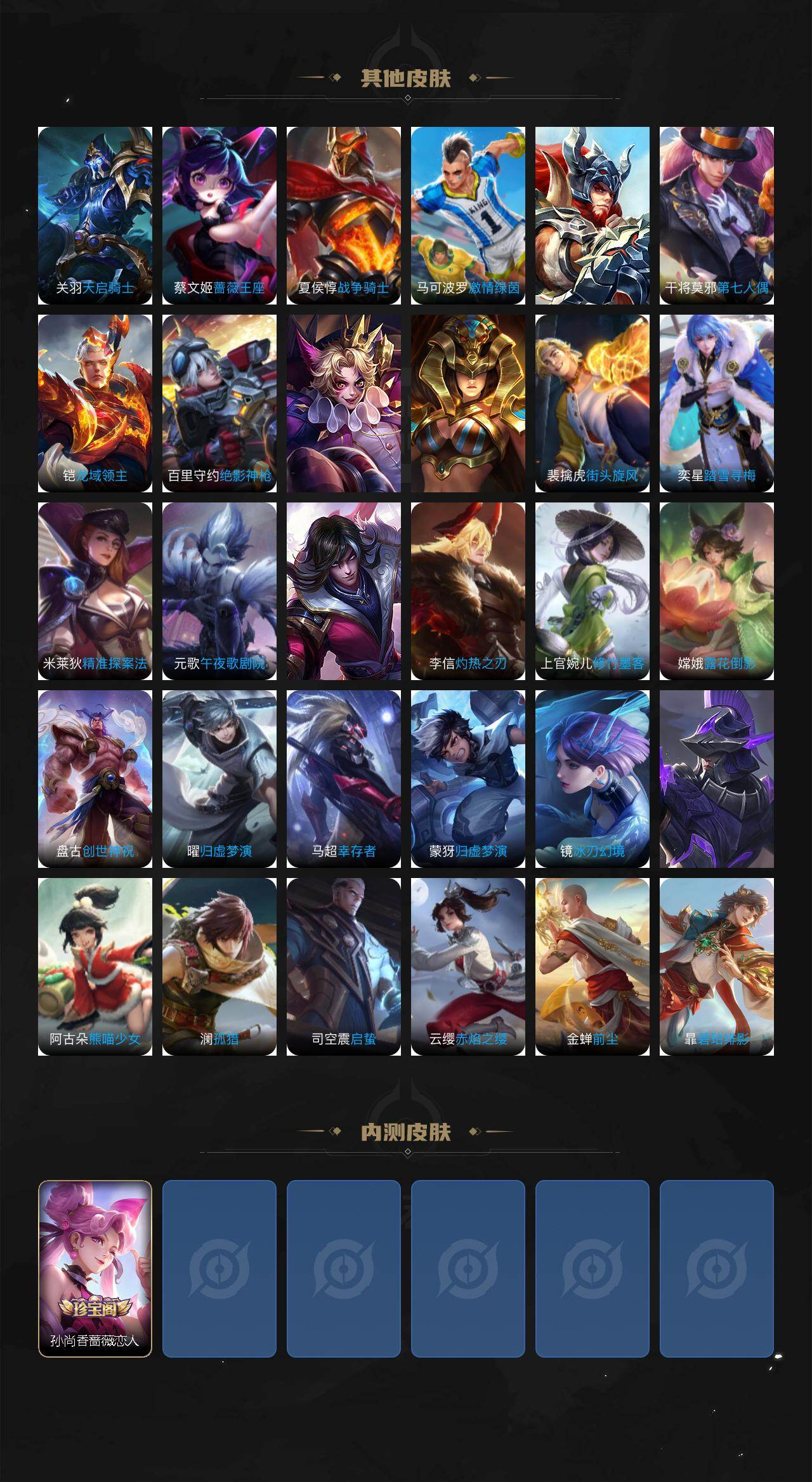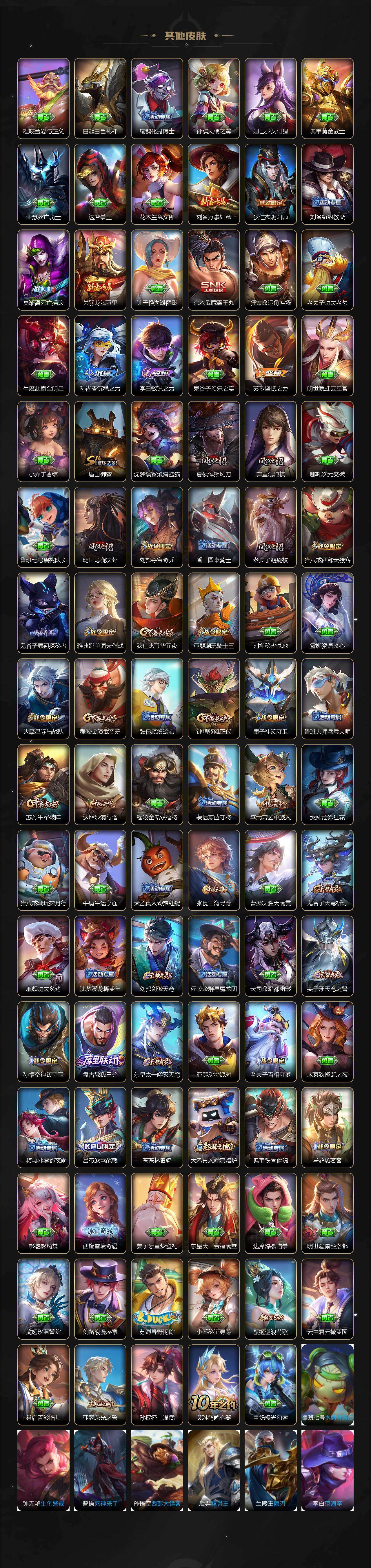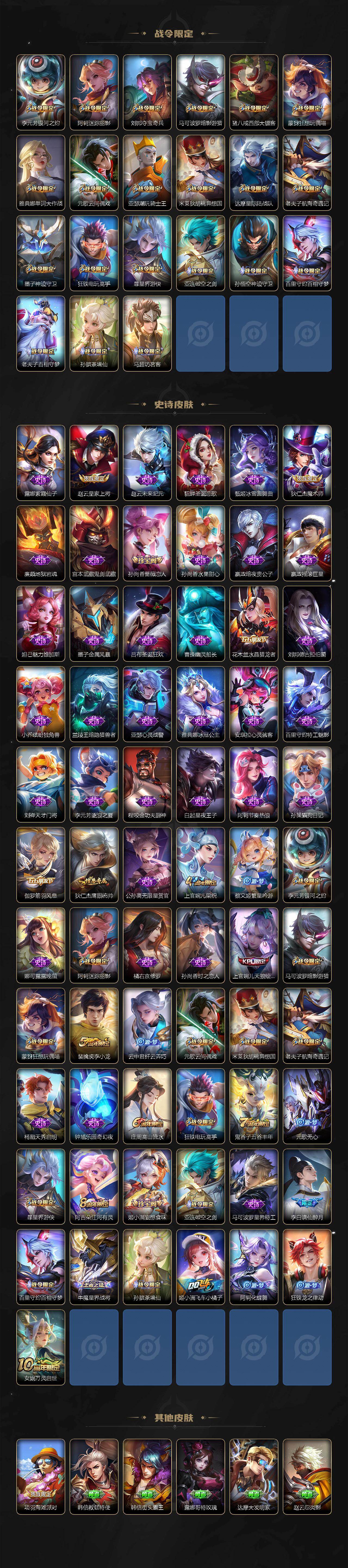 【限定皮肤】:姜子牙天穹之誓,李白谪仙醉月,狄仁杰阴阳师,赵云皇家上将,墨子神迹守卫,孙尚香蔷薇恋人,庄周高山流水,高渐离死亡摇滚,阿轲迷踪丽影,元歌云间偶戏,元歌无心,夏侯惇朔风刀,马可波罗暗影游猎,狄仁杰魔术师,狄仁杰万华元夜,达摩星际陆战队,达摩沙漠行僧,项羽海滩派对,老夫子醍醐杖,老夫子航海奇遇记,关羽武圣,程咬金演武夺筹,刘邦夺宝奇兵,亚瑟潮玩骑士王,孙悟空零号赤焰,李元芳银河之约,李元芳云中旅人,钟馗驱傩正仪,雅典娜单词大作战,蔡文姬繁星吟游,鬼谷子原初探秘者,鬼谷子五谷丰年,苏烈千军破阵,弈星混沌棋,明世隐疑决卦,裴擒虎李小龙,狂铁电玩高手,米莱狄胡桃异想国,云中君纤云弄巧,盾山御銮,猪八戒西部大镖客,上官婉儿梁祝,上官婉儿天狼绘梦者,蒙犽狂想玩偶喵,暃星界游侠,阿古朵江河有灵,张良古海寻踪,鬼谷子天穹祈灯,姬小满妄想食味,沈梦溪龙舞盛年,刘邦剑破天穹,程咬金群星魔术团