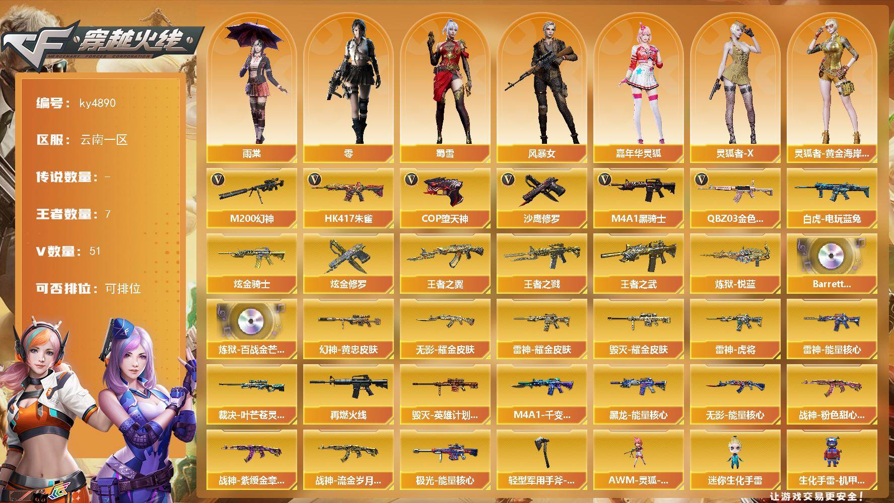 [16479763]云南一区-51V-7王者-2炫金 【热门武器】:QBZ03-金色蔷薇,HK417-朱雀,M200-幻神,白虎-电玩蓝兔,M4A1-黑骑士*2,COP-堕天神,沙鹰-修罗 【王者炫金武器】:王者之戮,王者之翼,王者之武,炼狱-悦蓝,炫金骑士,炫金修罗 【音效卡】:Barrett-碧霄极光音效卡,炼狱-百战金芒-庆典舞曲音效卡 【皮肤】:M200-幻神-黄忠皮肤,裁决-叶芒苍灵 皮肤,雷神-能量核心,雷神-虎将,雷神-耀金皮肤,M4A1-再燃火线,毁灭耀金皮肤,毁灭-英雄计划 皮肤,M4A1-千变-孔明皮肤,黑龙-能量核心,无影-能量核心,无影耀金皮肤,战神-粉色甜心皮肤*2,战神-紫绶金章皮肤,战神-流金岁月皮肤,极光-能量核心,轻型军用手斧-再燃火线 【角色】:零,雨棠,风暴女,嘉年华灵狐,灵狐者-X,灵狐者-黄金海岸,曼陀罗-X,潘多拉-X,潘多拉-甜心教官,邱刚敖,蜀雪,雪莉杨-摸金校尉,影武者-X 【人偶武器】:迷你钢铁终结者,AWM-灵狐-15周年嘉年华*2,迷你生化手雷,生化手雷-机甲核心 【暴走生化】:超级对讲机 【挑战大师】:阐释者III 【英雄级武器】:M4A1-黑龙,M4A1-雷神*2,M4A1-黑骑士*2,HK417-朱雀,无影-神兵利器,QBZ03-金色蔷薇,AK-47-猩红传说*3,白虎-电玩蓝兔,Barrett-毁灭,Barrett-极光,AWM-裁决,M200-幻神,王者之怒-觉醒版,炼狱-百战金芒,炼狱-悦蓝-觉醒版,沙鹰-修罗,沙鹰-天神,COP-雷霆,COP-堕天神,麒麟刺-堕天神,斩神刀-雷暴,麒麟刺-百战金芒,王者之啸-觉醒版,高爆手雷-雷霆,高爆手雷-雷暴,高爆手雷-堕天神,高爆手雷-竞技荣光,闪光弹-雷霆,闪光弹-雷暴,闪光弹-堕天神,闪光弹-竞技荣光*3,烟雾弹-雷霆,烟雾弹-雷暴,烟雾弹-堕天神,烟雾弹-竞技荣光*2 【道具】:CFS限定背包,百战金芒炫彩背包,超级背包,女皇终结者-魔龙之吻,绿色巨人,灵魂忍者,迷雾幽灵*2,夺命之镰,防化服*3,金色流光-枪王排位*2,星辰流光-枪王排位,枪王排位28赛季金色流光,枪王排位29赛季金色流光,语音特效-盛典烟火,萌萌小葵表情,动感闪耀表情,防弹头盔*8,防弹衣*8,C4工具钳*4,手雷包*3 【特殊枪械】:2黑骑士