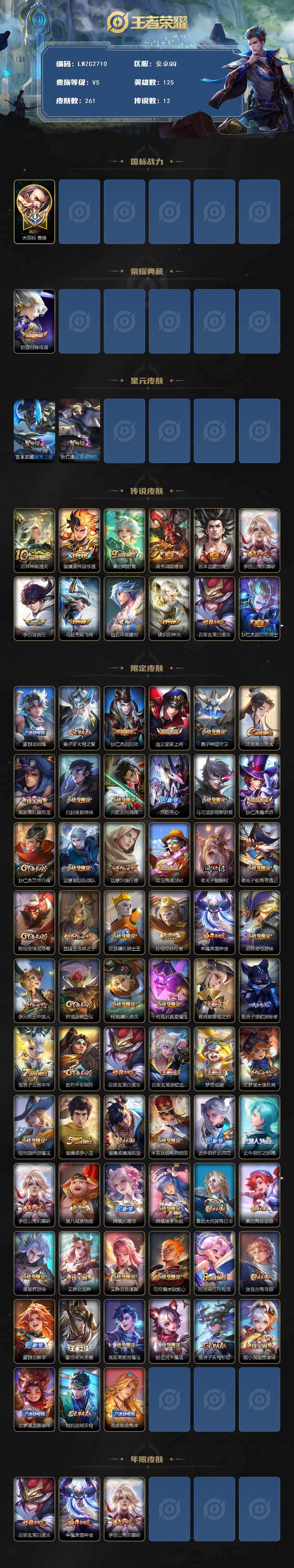 [16479826]【特价急出/详情看图】安卓Q-V5-永恒钻石II段位-125英雄-261皮肤-1典藏皮肤-2星元-12传说-76史诗