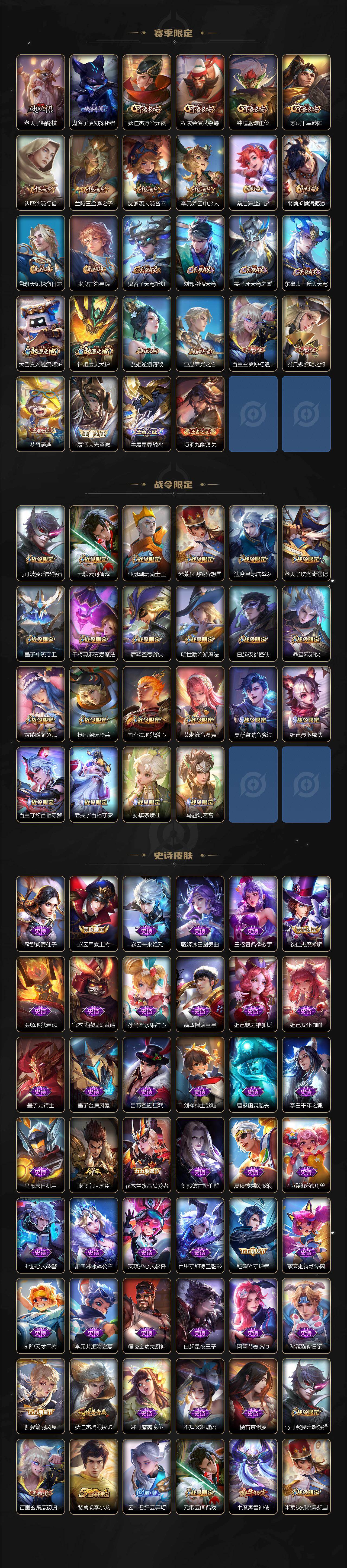 【赛季限定】:老夫子醍醐杖,鬼谷子原初探秘者,狄仁杰万华元夜,程咬金演武夺筹,钟馗驱傩正仪,苏烈千军破阵,达摩沙漠行僧,兰陵王金庭之子,沈梦溪大漠名商,李元芳云中旅人,桑启海盐诗旅,裴擒虎擒涛扼浪,鲁班大师探海日志,张良古海寻踪,鬼谷子天穹祈灯,刘邦剑破天穹,姜子牙天穹之誓,东皇太一噬灭天穹,太乙真人谧流熔炉,钟馗虚灵犬护,甄姬逆浪荇歌,亚瑟荣光之誓,百里玄策原初追逐者,雅典娜黎明之约,梦奇顽趣,蒙恬荣光圣徽,牛魔星界战将,项羽九幽镇关