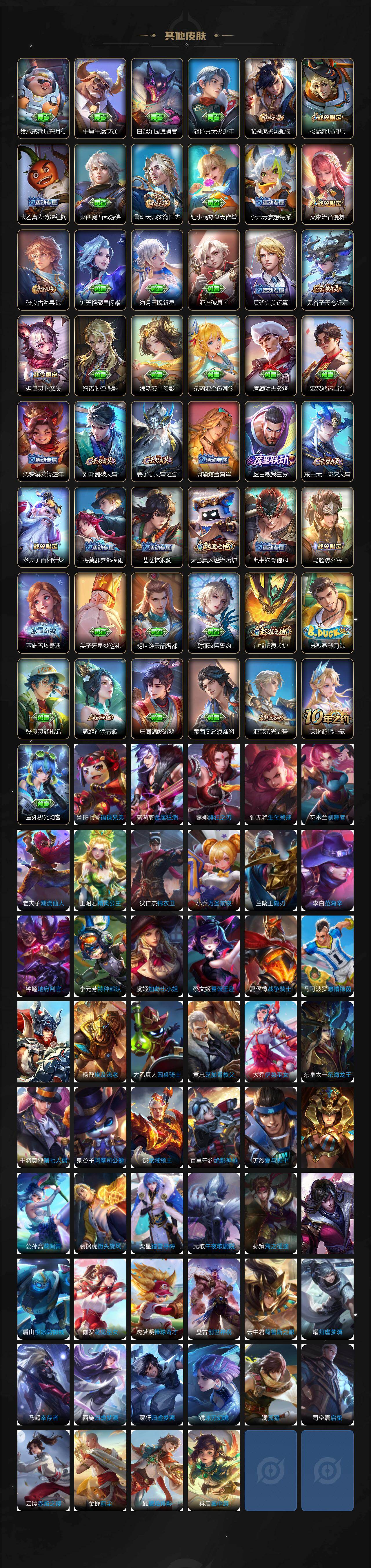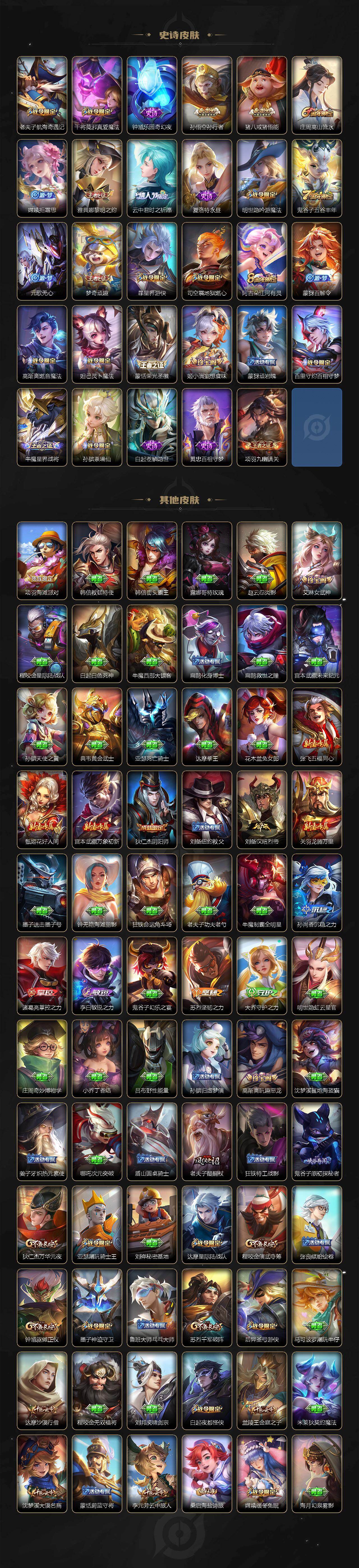 【限定皮肤】:蒙犽顽岩魄,姜子牙天穹之誓,狄仁杰阴阳师,赵云皇家上将,墨子神迹守卫,庄周高山流水,高渐离玩趣恶龙,白起夜都怪侠,元歌云间偶戏,元歌无心,马可波罗暗影游猎,狄仁杰魔术师,狄仁杰万华元夜,达摩星际陆战队,达摩沙漠行僧,项羽海滩派对,老夫子醍醐杖,老夫子航海奇遇记,程咬金演武夺筹,兰陵王金庭之子,亚瑟潮玩骑士王,孙悟空孙行者,牛魔奔雷神使,后羿圣弓游侠,李元芳云中旅人,钟馗驱傩正仪,杨戬潮玩骑兵,干将莫邪真爱魔法,雅典娜黎明之约,鬼谷子原初探秘者,鬼谷子五谷丰年,苏烈千军破阵,百里玄策白虎志,百里玄策原初追逐者,梦奇顽趣,沈梦溪大漠名商,明世隐吟游魔法,裴擒虎李小龙,裴擒虎擒涛扼浪,米莱狄胡桃异想国,云中君纤云弄巧,云中君时之祈愿,李信山海炽霜斩,猪八戒猪悟能,嫦娥拒霜思,嫦娥暖冬兔眠,鲁班大师探海日志,桑启海盐诗旅,暃星界游侠,艾琳女武神,艾琳流音漫舞,司空震地狱燃心,阿古朵江河有灵,张良古海寻踪,蒙犽百解令,蒙恬荣光圣徽,高渐离燃音魔法,妲己灵卜魔法,鬼谷子天穹祈灯,姬小满妄想食味,沈梦溪龙舞盛年,刘邦剑破天穹,周瑜熔金海岸