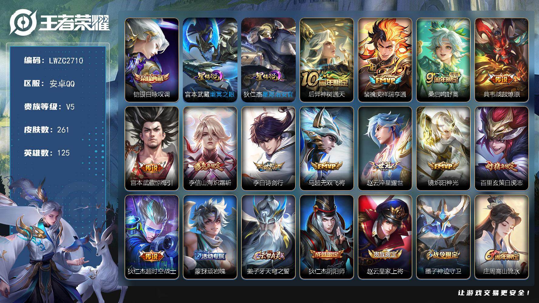 - [14128108]【店主推荐捡漏号!可直接换绑】安卓Q-V9-最强王者段位-127英雄-316皮肤-2典藏-1珍品传说-33传说-95史诗-3星元 【英雄全皮】:苍全皮,李信全皮,蒙恬全皮,夏洛特全皮,司空震全皮,戈娅全皮,影全皮 【荣耀典藏】:芈月大秦宣太后,花木兰九霄神辉 【珍品传说】:张飞兔狲蓬尾 【传说皮肤】:后羿神树通天,公孙离云诺千山,司空震愿照山河定,女娲愿照千秋盛,澜愿照九州拓,云缨幻光神枪,桑启鸣野蒿,澜逐花归海,露娜霜月吟,宫本武藏惊梅引,云缨鹤归松栖,上官婉儿妄想奇谈,诸葛亮鹤羽星尊,夏洛特浮生妄,李信山海炽霜斩,吕布怒海麟威,李白诗剑行,孙尚香异界灵契,貂蝉遇见胡旋,李元芳飞鸢探春,兰陵王默契交锋,公孙离祈雪灵祝,镜炽阳神光,虞姬启明星使,曜云鹰飞将,李信一念神魔,刘备时之恋人,伽罗太华,干将莫邪久胜战神,达摩黄金狮子座,百里玄策白虎志,貂蝉仲夏夜之梦,宫本武藏地狱之眼 【限定皮肤】:蒙犽顽岩魄,姜子牙天穹之誓,狄仁杰阴阳师,赵云皇家上将,赵云引擎之心,墨子神迹守卫,嬴政优雅恋人,孙尚香蔷薇恋人,孙尚香异界灵契,庄周高山流水,阿轲迷踪丽影,钟无艳超时空战士,扁鹊奇幻香踪,白起夜都怪侠,芈月幻夜卜梦,元歌云间偶戏,元歌无心,甄姬落雪兰心,马可波罗暗影游猎,狄仁杰魔术师,狄仁杰万华元夜,达摩沙漠行僧,项羽海滩派对,老夫子醍醐杖,老夫子航海奇遇记,貂蝉遇见胡旋,程咬金演武夺筹,刘邦夺宝奇兵,韩信飞衡,王昭君午后时光,兰陵王默契交锋,兰陵王金庭之子,花木兰默契交锋,亚瑟潮玩骑士王,孙悟空大圣娶亲,孙悟空孙行者,后羿圣弓游侠,李元芳匿光侦查者,李元芳云中旅人,虞姬启明星使,钟馗驱傩正仪,杨玉环遇见飞天,杨戬潮玩骑兵,哪吒逐梦之翼,干将莫邪真爱魔法,雅典娜单词大作战,鬼谷子原初探秘者,鬼谷子五谷丰年,诸葛亮鹤羽星尊,黄忠火炮绅士,苏烈千军破阵,百里玄策白虎志,公孙离祈雪灵祝,沈梦溪大漠名商,明世隐疑决卦,明世隐吟游魔法,裴擒虎李小龙,裴擒虎擒涛扼浪,狂铁电玩高手,云中君纤云弄巧,云中君时之祈愿,李信山海炽霜斩,伽罗太华,猪八戒西部大镖客,上官婉儿妄想奇谈,嫦娥拒霜思,嫦娥暖冬兔眠,西施玲珑珍味,蒙犽狂想玩偶喵,鲁班大师探海日志,桑启海盐诗旅,夏洛特浮生妄,暃星界游侠,戈娅驭风魔法,艾琳女武神,艾琳流音漫舞,赵怀真鹤归松栖,云缨鹤归松栖,司空震地狱燃心,阿古朵江河有灵,张