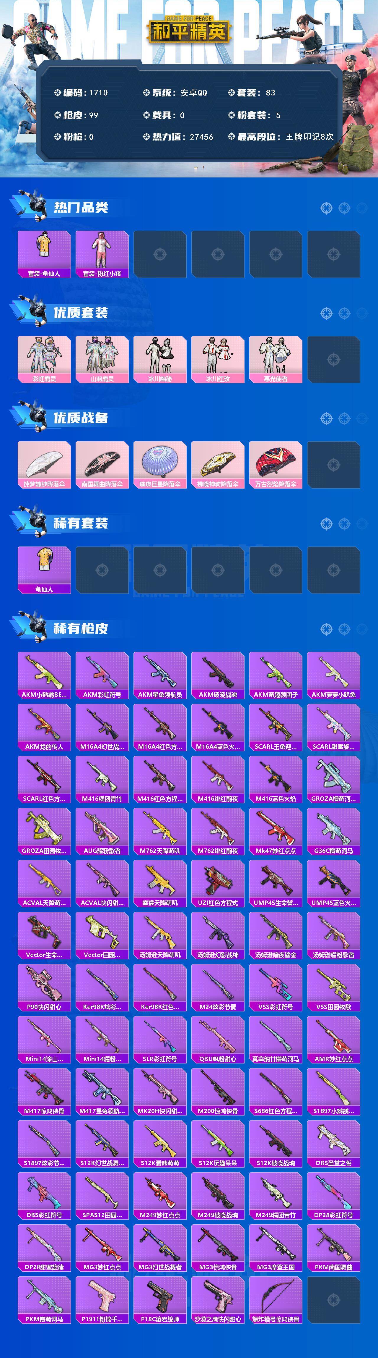 [16480518]【1710】安卓 手Q-5粉装-0特效枪-0载具-0粉色飞行器-27456热力值-8王牌印记-83套装-99枪皮 【热门品类】:套装-龟仙人,套装-粉红小猪 【粉色套装】:粉装-彩虹鹿灵,粉装-山涧鹿灵,粉装-冰川幽秘,粉装-冰川红玫,粉装-寒光使者 【粉色降落伞】:纯梦嫁纱降落伞,南国舞曲降落伞,璀璨巨星降落伞,拂晓神骑降落伞,万古烈焰降落伞 【稀有套装】:套装-龟仙人 【稀有枪皮】:AKM-小鹦鹉BEBE,AKM-彩虹符号,AKM-星兔领航员,AKM-破晓战魂,AKM-萌趣颜团子,AKM-萝萝小趴兔,AKM-龙的传人,M16A4-幻世战舞者,M16A4-红色方程式,M16A4-蓝色火焰,SCAR-L-玉兔迎春,SCAR-L-甜蜜旋律,SCAR-L-红色方程式,M416-糯团青竹,M416-红色方程式,M416-绯红前夜,M416-蓝色火焰,GROZA-懵萌河马,GROZA-田园牧歌,AUG-耀粉歌者,M762-天降萌叽,M762-绯红前夜,Mk47-妙红点点,G36C-懵萌河马,AC-VAL-天降萌叽,AC-VAL-快闪甜心,蜜獾-天降萌叽,UZI-红色方程式,UMP45-生命誓言,UMP45-蓝色火焰,Vector-生命誓言,Vector-田园牧歌,汤姆逊-天降萌叽,汤姆逊-幻影战神,汤姆逊-暗夜鎏金,汤姆逊-耀粉歌者,P90-快闪甜心,Kar98K-炫彩节奏,Kar98K-红色方程式,M24-炫彩节奏,VSS-彩虹符号,VSS-田园牧歌,Mini14-涂山之恋,Mini14-耀粉歌者,SLR-彩虹符号,QBU-飒粉甜心,莫辛纳甘-懵萌河马,AMR-妙红点点,M417-惊鸿侠骨,M417-星兔领航员,MK20-H-快闪甜心,M200-惊鸿侠骨,S686-红色方程式,S1897-小鹦鹉BEBE,S1897-炫彩节奏,S12K-玩趣呆呆,S12K-破晓战魂,S12K-幻世战舞者,S12K-暖熊萌萌,DBS-圣堂之誓,DBS-彩虹符号,SPAS-12-田园牧歌,M249-妙红点点,M249-破晓战魂,M249-糯团青竹,DP-28-彩虹符号,DP-28-甜蜜旋律,MG3-妙红点点,MG3-幻世战舞者,MG3-惊鸿侠骨,MG3-摩登王国,PKM-南国舞曲,PKM-懵萌河马,P1911-粉锦千层,P18C-熔岩统帅,沙漠之鹰-快闪甜心,爆炸猎弓-惊鸿侠骨 【其他套装】