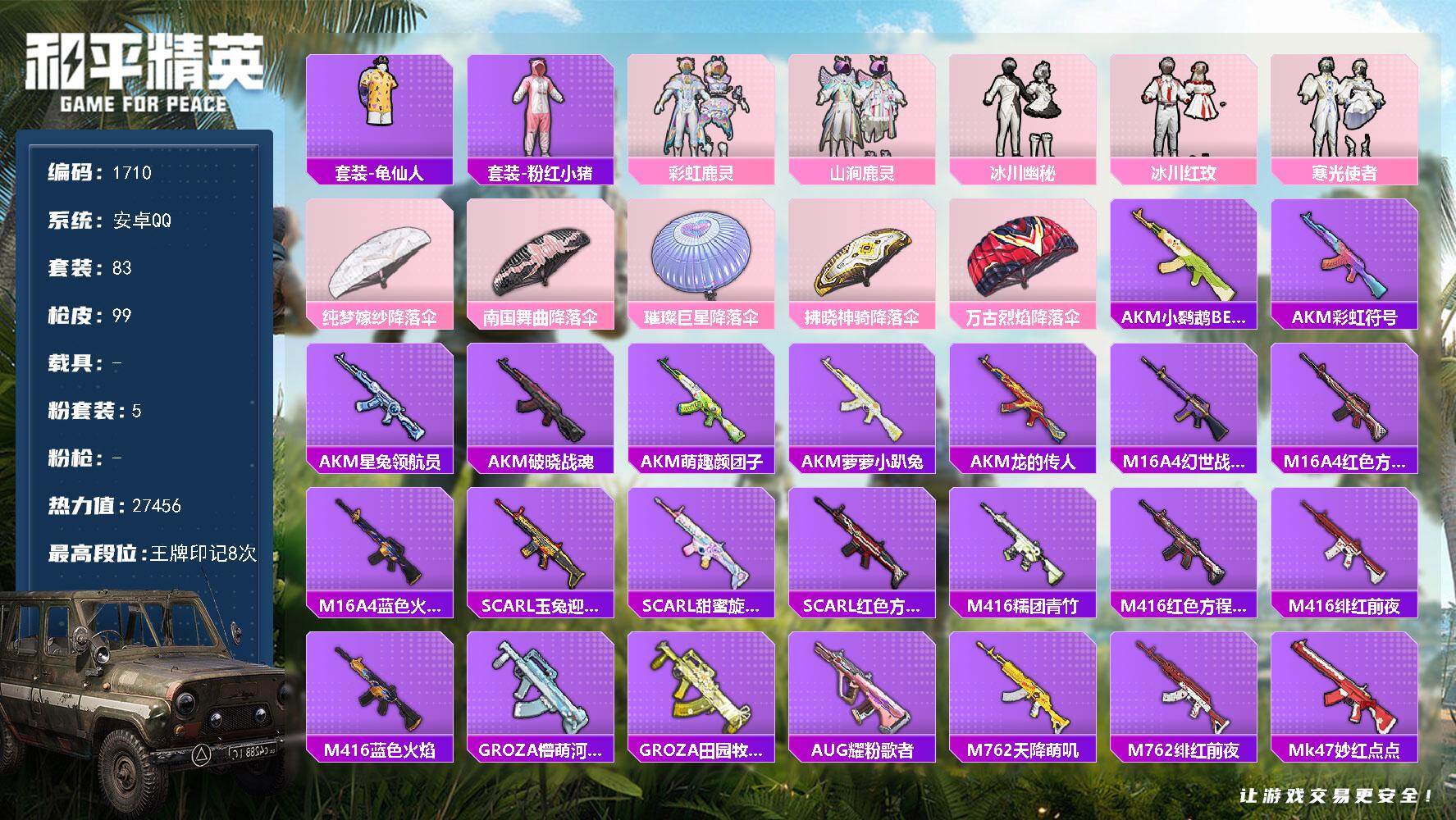 [16480518]【1710】安卓 手Q-5粉装-0特效枪-0载具-0粉色飞行器-27456热力值-8王牌印记-83套装-99枪皮