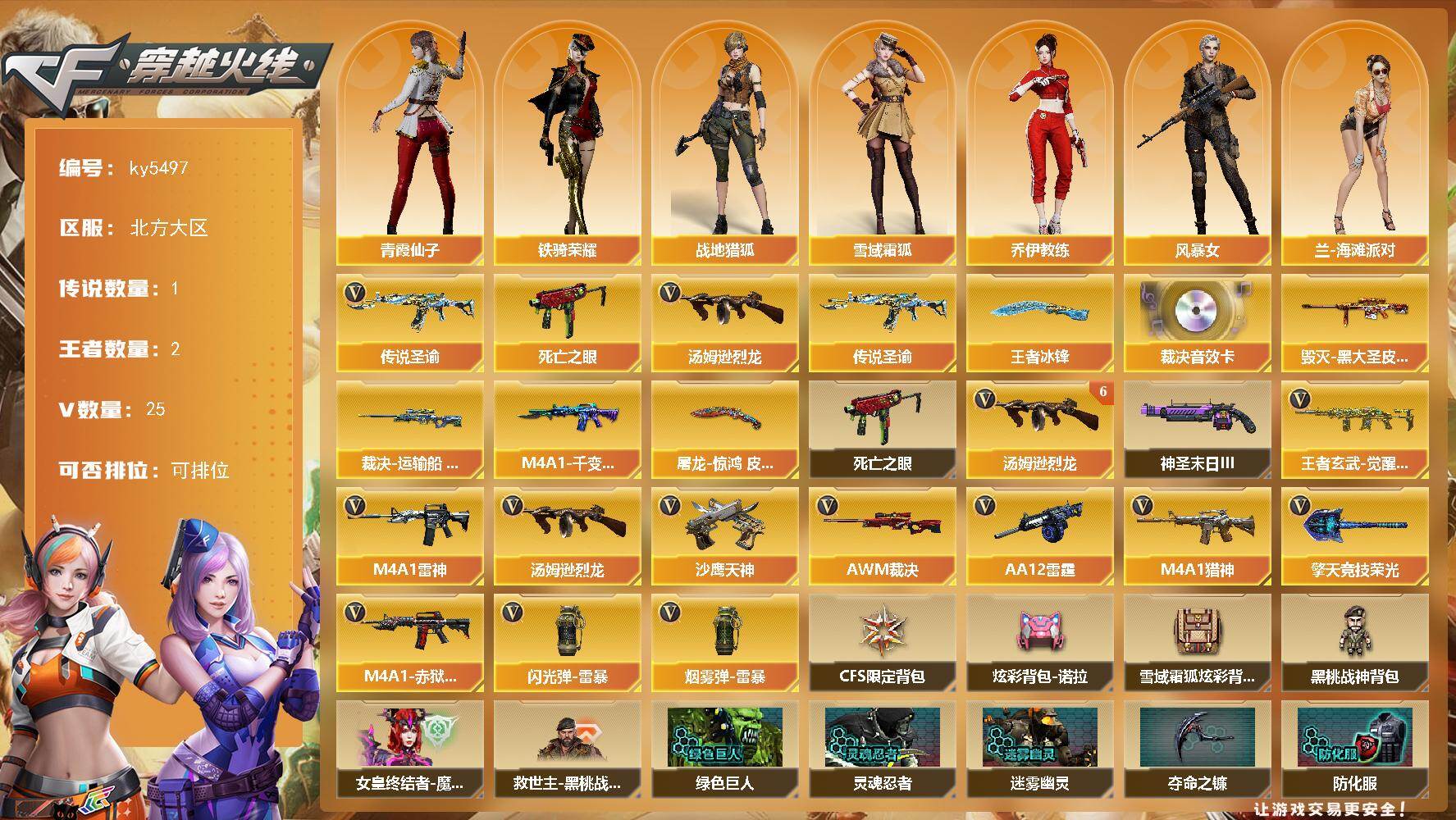 [16482790]北方大区-29V-2王者武器数-0炫金武器数 【传说武器】:传说圣谕 【热门武器】:传说圣谕,死亡之眼,汤姆逊-烈龙*6 【王者炫金武器】:王者冰锋 【音效卡】:AWM-裁决音效卡 【皮肤】:裁决-运输船 皮肤,毁灭-黑大圣皮肤,M4A1-千变-孔明皮肤,屠龙-惊鸿 皮肤 【角色】:战地猎狐,雪域霜狐,乔伊教练,风暴女,兰-海滩派对,灵狐者-七夕宝贝,曼陀罗-X,青霞仙子,蛇姬,斯沃特-X,铁骑荣耀,樱-战斗天使,影武者-X 【暴走生化】:死亡之眼 【挑战大师】:神圣爆裂者-末日III 【英雄级武器】:M4A1-雷神*2,M4A1-猎神,王者玄武-觉醒版,AWM-裁决,汤姆逊-烈龙*6,AA-12-雷霆,沙鹰-天神*4,擎天-竞技荣光,闪光弹-雷暴,烟雾弹-雷暴,M4A1-赤狱骑士 【道具】:CFS限定背包,炫彩背包-诺拉,雪域霜狐炫彩背包,黑桃战神背包,女皇终结者-魔龙之吻,救世主-黑桃战神,绿色巨人,灵魂忍者,迷雾幽灵,夺命之镰,防化服*3,金色流光-枪王排位,星辰流光-枪王排位,枪王排位28赛季金色流光,语音特效-怀旧,雪域霜狐表情,动感闪耀表情,C4-再燃火线,防弹头盔*4,防弹衣*4,C4工具钳*5,手雷包*5 【特殊枪械】:6烈龙