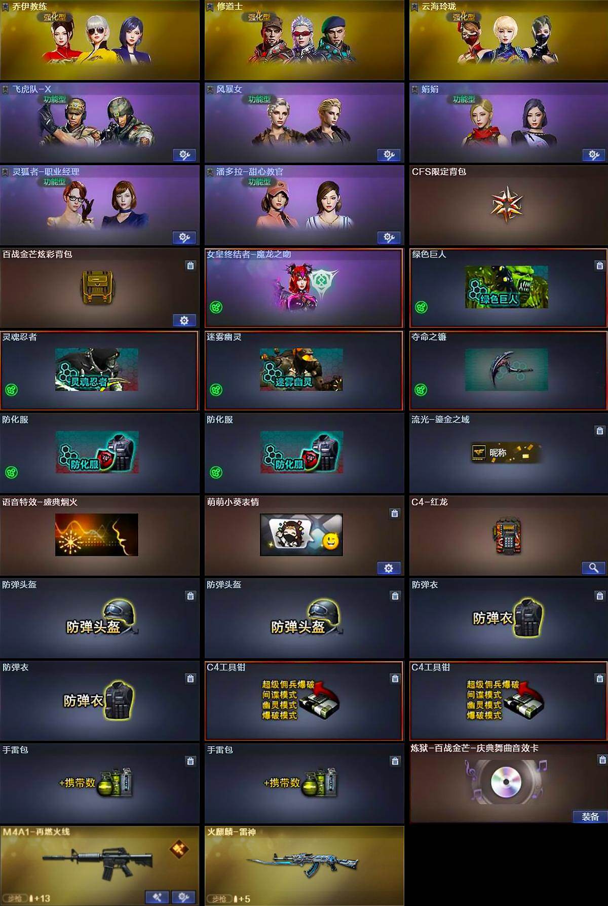 【道具】:CFS限定背包,百战金芒炫彩背包,女皇终结者-魔龙之吻,绿色巨人,灵魂忍者,迷雾幽灵,夺命之镰,防化服*2,流光-鎏金之域,语音特效-盛典烟火,萌萌小葵表情,C4-红龙,防弹头盔*2,防弹衣*2,C4工具钳*2,手雷包*2