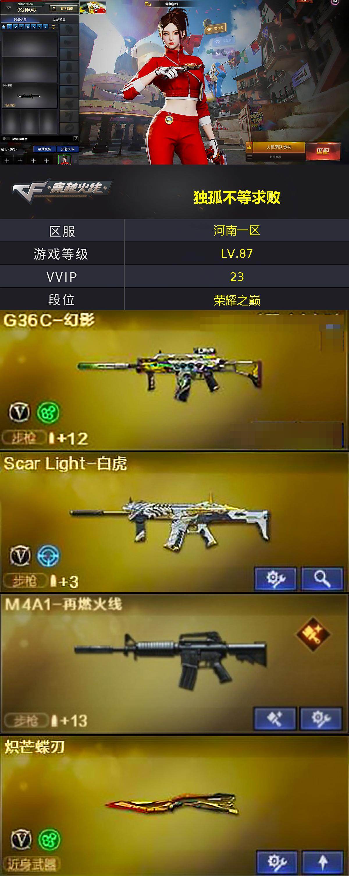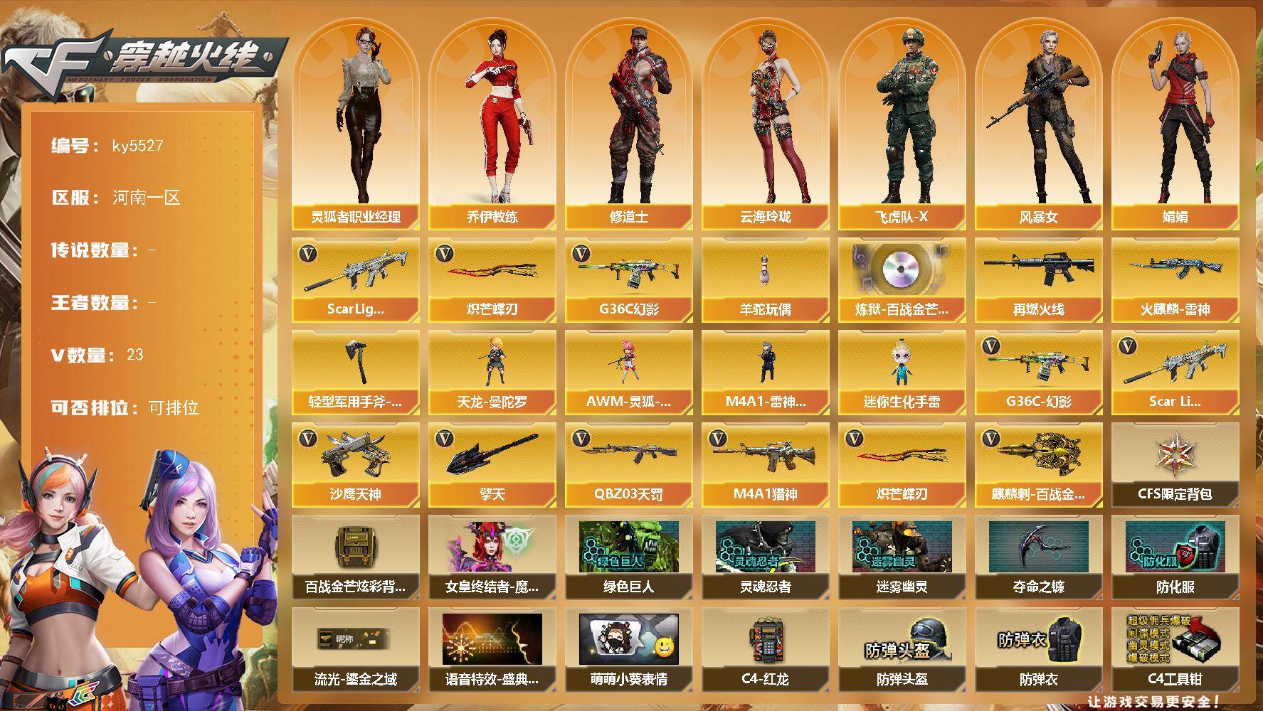 [16482972]河南一区-25V-0王者武器数-0炫金武器数 【热门武器】:G36C-幻影,Scar Light-白虎,羊驼玩偶,炽芒蝶刃 【音效卡】:炼狱-百战金芒-庆典舞曲音效卡 【皮肤】:M4A1-再燃火线,火麒麟-雷神,轻型军用手斧-再燃火线 【角色】:乔伊教练,修道士,云海玲珑,飞虎队-X,风暴女,娟娟,0号玩家,灵狐者-职业经理,潘多拉-甜心教官,兔囡囡 【人偶武器】:天龙-曼陀罗,M4A1-雷神-精英刀锋,AWM-灵狐-15周年嘉年华,迷你生化手雷 【英雄级武器】:Scar Light-白虎,QBZ03-天罚,G36C-幻影,M4A1-猎神*2,沙鹰-天神*5,擎天,炽芒蝶刃,麒麟刺-百战金芒 【道具】:CFS限定背包,百战金芒炫彩背包,女皇终结者-魔龙之吻,绿色巨人,灵魂忍者,迷雾幽灵,夺命之镰,防化服*2,流光-鎏金之域,语音特效-盛典烟火,萌萌小葵表情,C4-红龙,防弹头盔*2,防弹衣*2,C4工具钳*2,手雷包*2 【特殊枪械】:1白虎