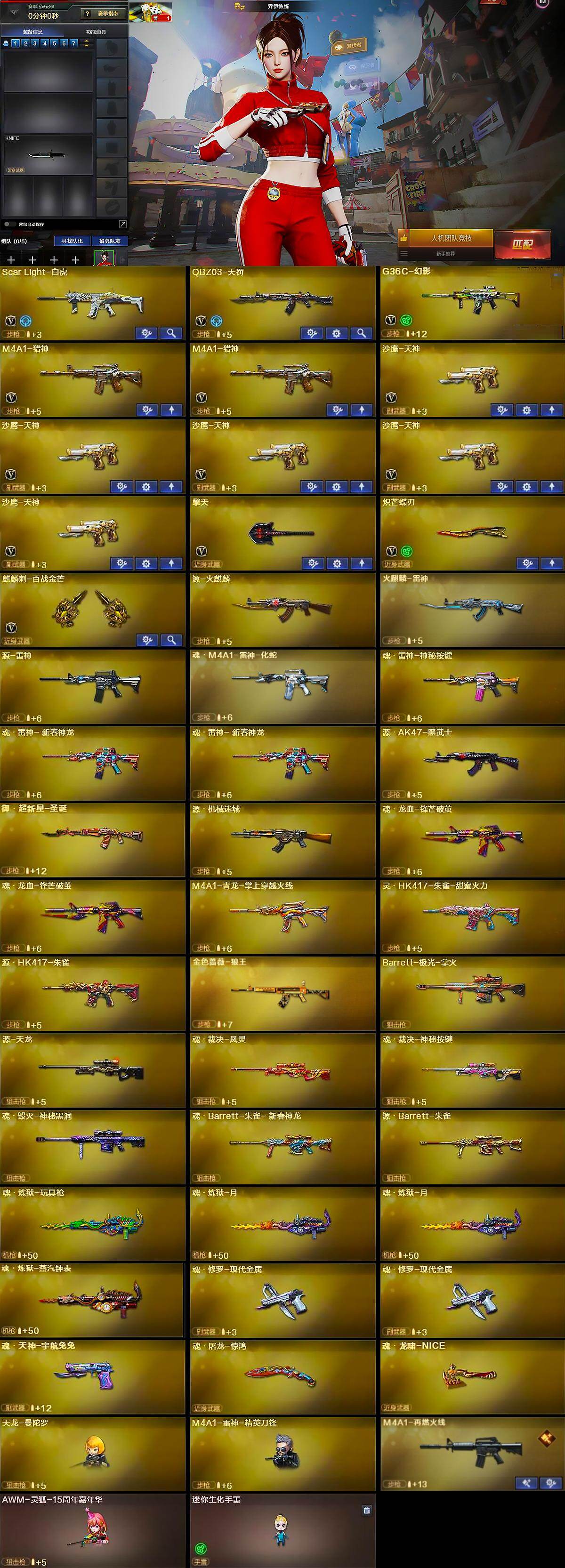 【英雄级武器】:Scar Light-白虎,QBZ03-天罚,G36C-幻影,M4A1-猎神*2,沙鹰-天神*5,擎天,炽芒蝶刃,麒麟刺-百战金芒