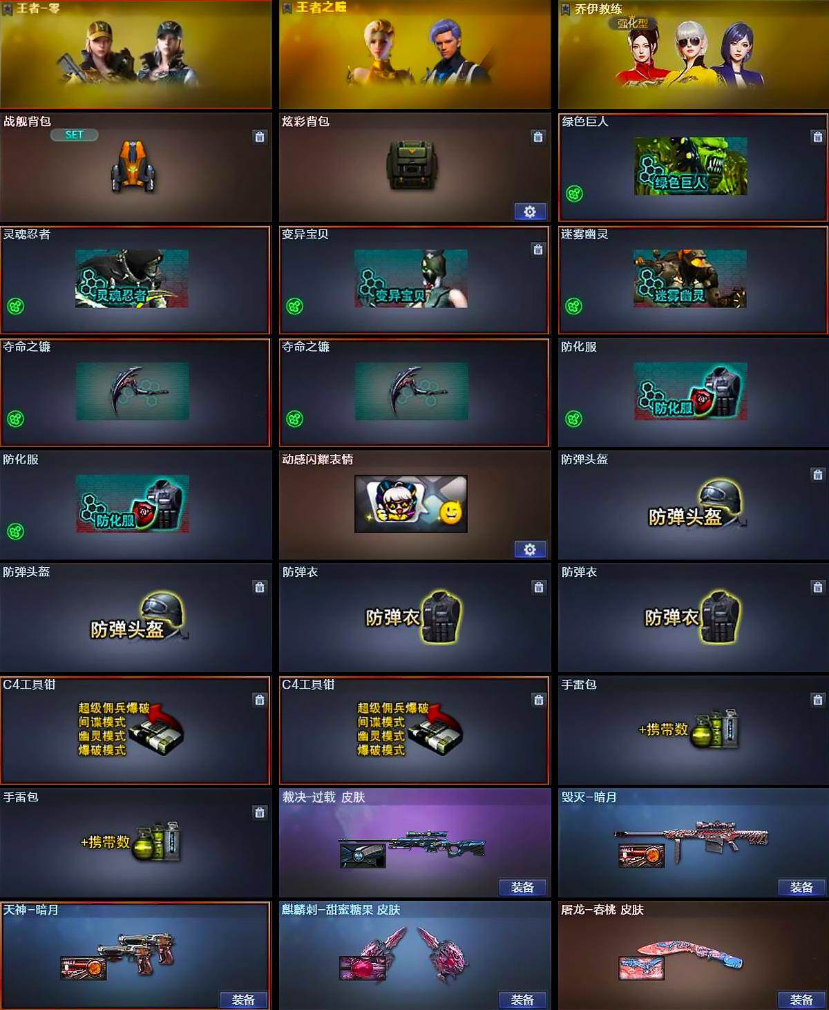 【道具】:战舰背包,炫彩背包,绿色巨人,灵魂忍者,变异宝贝,迷雾幽灵,夺命之镰*2,防化服*2,动感闪耀表情,防弹头盔*2,防弹衣*2,C4工具钳*2,手雷包*2