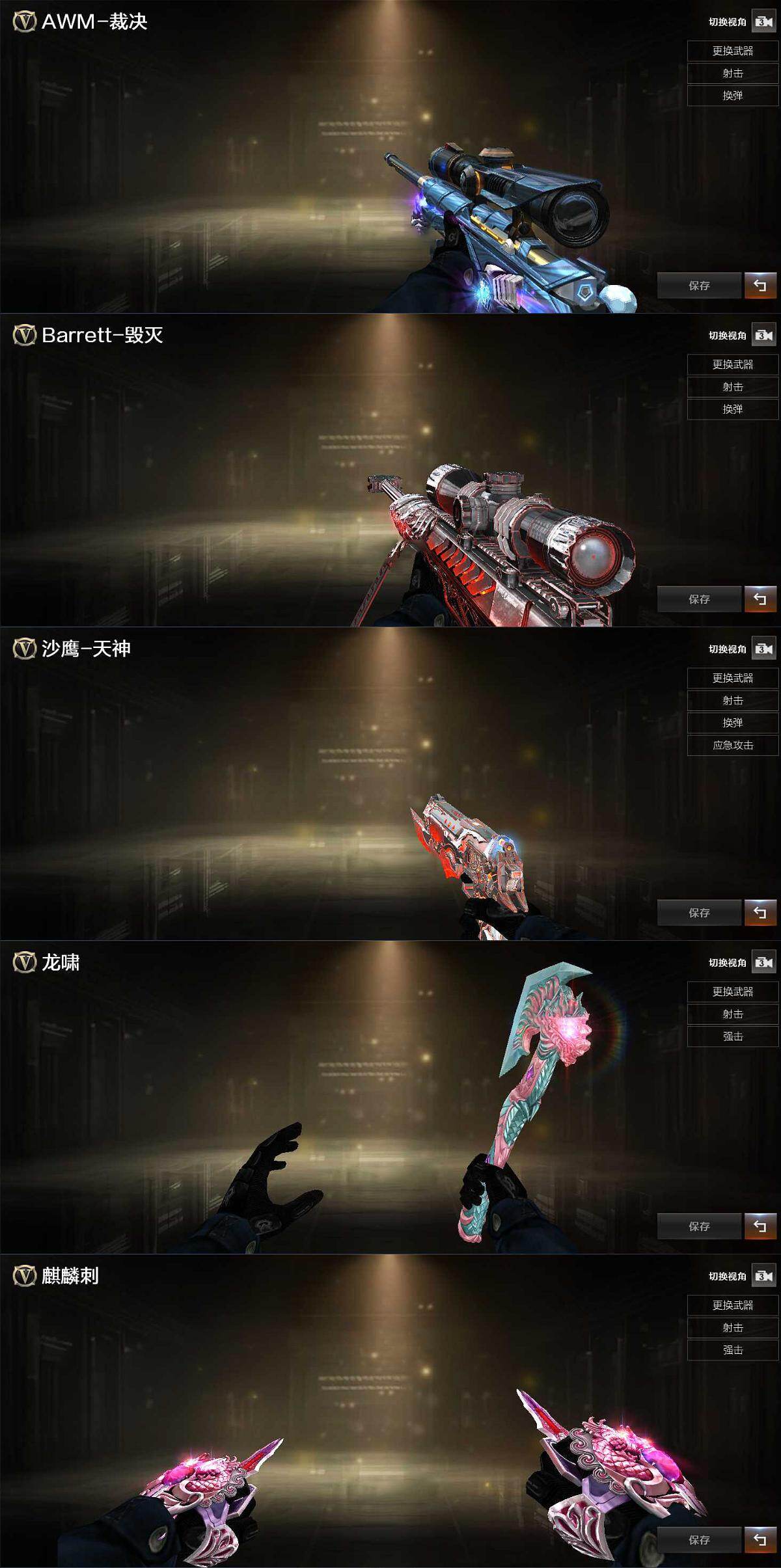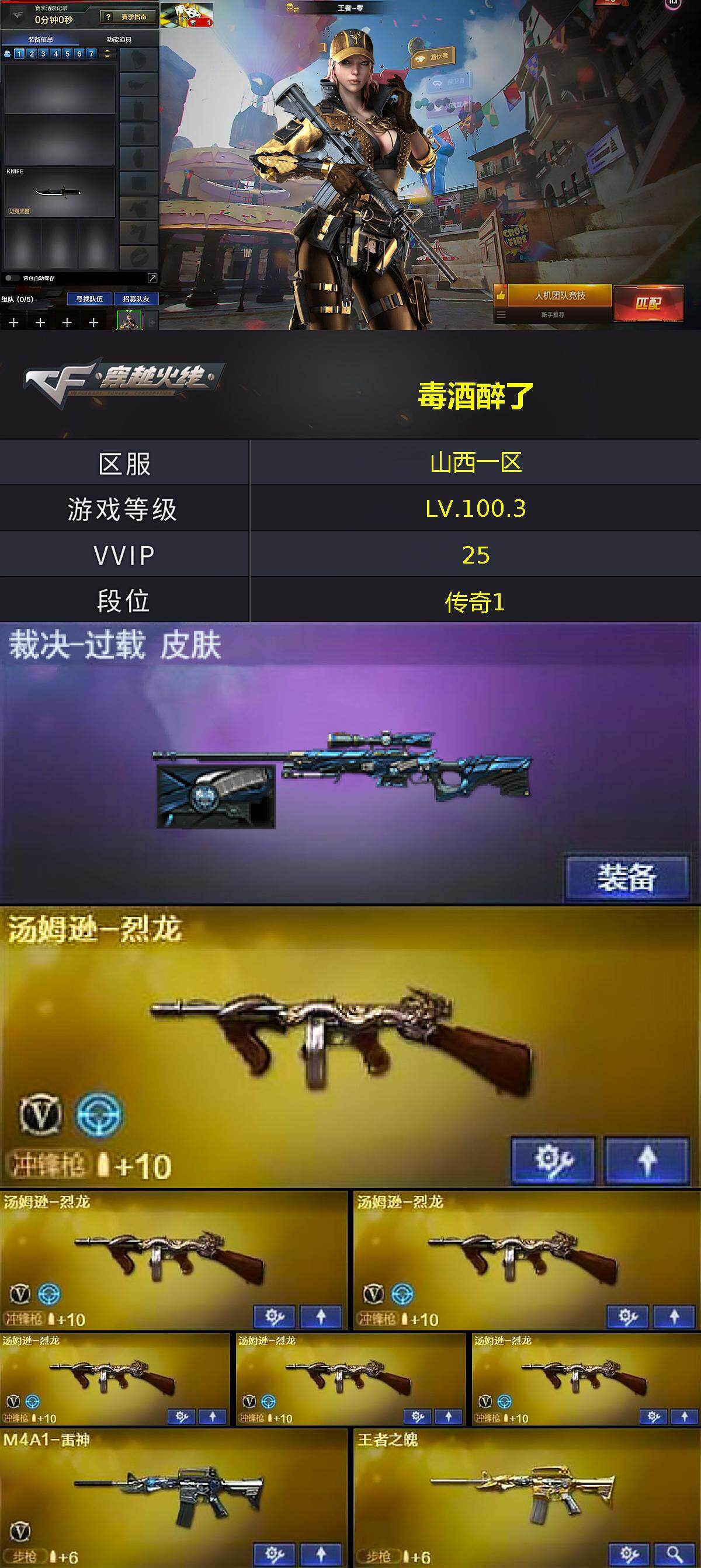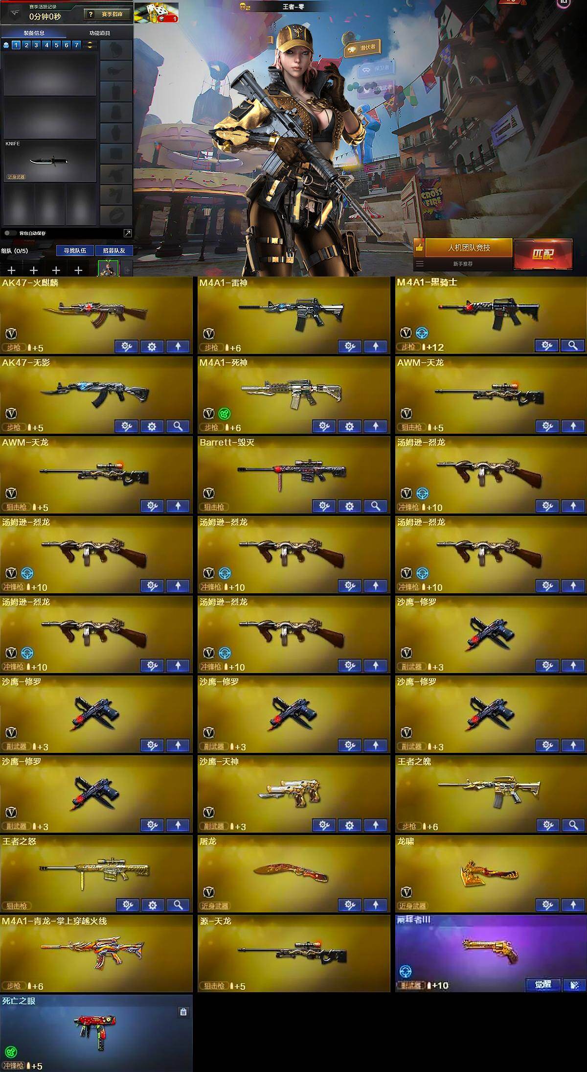 【英雄级武器】:AK47-火麒麟,M4A1-雷神,M4A1-黑骑士,AK47-无影,M4A1-死神,AWM-天龙*2,Barrett-毁灭,汤姆逊-烈龙*6,沙鹰-修罗*5,沙鹰-天神,屠龙,龙啸