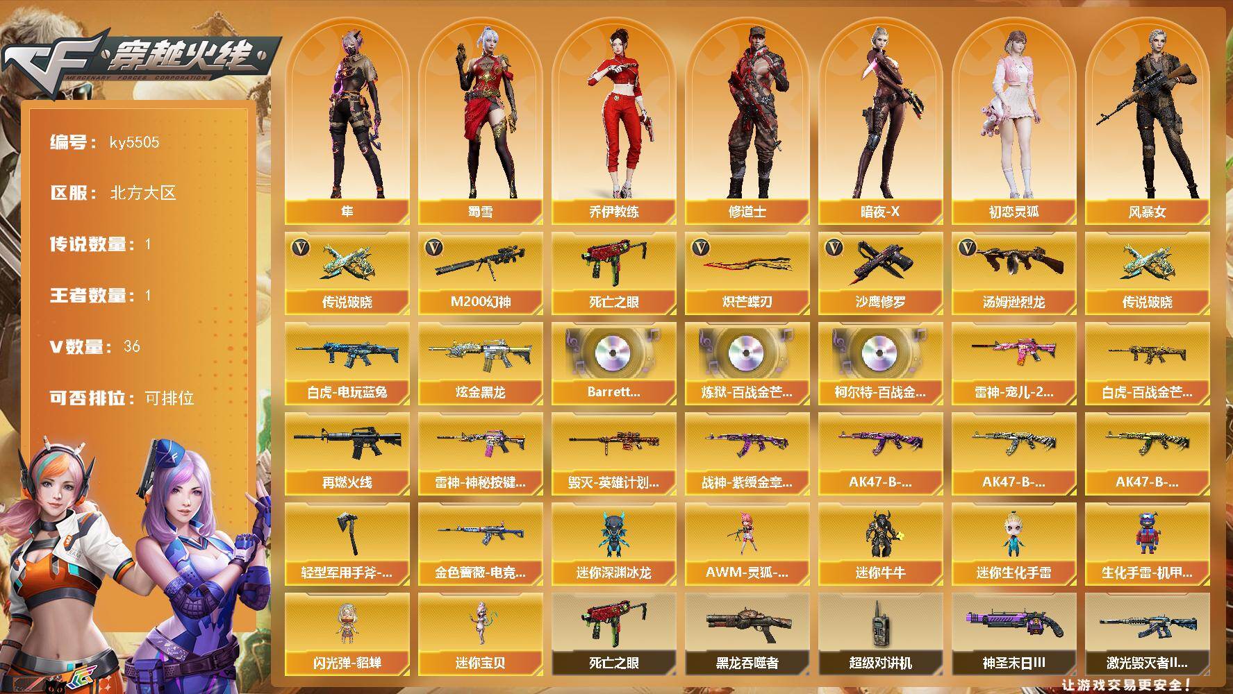 - [15248115]江苏一区-56V-4王者-0炫金 【传说武器】:传说夜影,传说幽冥 【热门武器】:传说夜影,传说幽冥,M14EBR-玄武,M200-幻神,柯尔特-荣耀世冠白鲨2023,羊驼玩偶 【王者炫金武器】:王者星光 【音效卡】:炼狱-百战金芒-庆典舞曲音效卡 【皮肤】:幻神-电流骇客 皮肤,幻神-荣耀世冠白鲨2023 皮肤,裁决-流光秘银,雷神-暗月,雷神-R.LGD-CFPLS18冠军,M4A1-再燃火线,雷神-神秘按键 皮肤,火麒麟-百城,天启-暗月,AWM-天龙-传奇白鲨,屠龙-荣耀之锋,屠龙-春桃 皮肤*2,轻型军用手斧-再燃火线,擎天-冠军之击,麒麟刺-月皮肤 【角色】:影豹,隼,司雨,王者岚兮儿,蛇隐宗,暗夜-X,灵狐-花神,潘多拉-甜心教官,蛇姬,铁骑荣耀,夜玫瑰-幻能朋克,影武者-X 【人偶武器】:迷你深渊冰龙 【挑战大师】:激光毁灭者III-白马银枪 【英雄级武器】:AK47-火麒麟,M4A1-雷神,AK12-天启,AN94-超新星,AK47-黑鲨,M4A1-龙血,M14EBR-玄武,王者芳薇-觉醒版,AWM-裁决*2,M200-幻神,王者之怒-觉醒版,炼狱-百战金芒,炼狱-悦蓝-觉醒版,AA-12-雷霆,沙鹰-天神*3,柯尔特-荣耀世冠白鲨2023,柯尔特-竞技荣光,屠龙*3,龙啸*2,擎天,麒麟刺,幻灵之锋,擎天-竞技荣光,麒麟刺-百战金芒,高爆手雷-幻灵*7,高爆手雷-竞技荣光*2,高爆手雷-古蛇迷踪,闪光弹-幻灵*3,闪光弹-竞技荣光*3,烟雾弹-幻灵*4,烟雾弹-竞技荣光,烟雾弹-古蛇迷踪,M4A1-赤狱骑士 【道具】:CFS限定背包,冰冰企鹅背包-猛男专用,次元之矛-黄金背包,炫彩背包,百战金芒炫彩背包,超级背包,女皇终结者-魔龙之吻,绿色巨人,灵魂忍者*2,迷雾幽灵*2,夺命之镰,防化服*2,金色流光-枪王排位,星辰流光-枪王排位,流光-鎏金之域,枪王排位28赛季金色流光,枪王排位29赛季金色流光,语音特效-盛典烟火,热带奇洋打击特效,蛇隐宗表情,萌萌小葵表情,电玩兔兔表情,防弹头盔*2,防弹衣*2,C4工具钳*2,手雷包*2 【特殊枪械】: