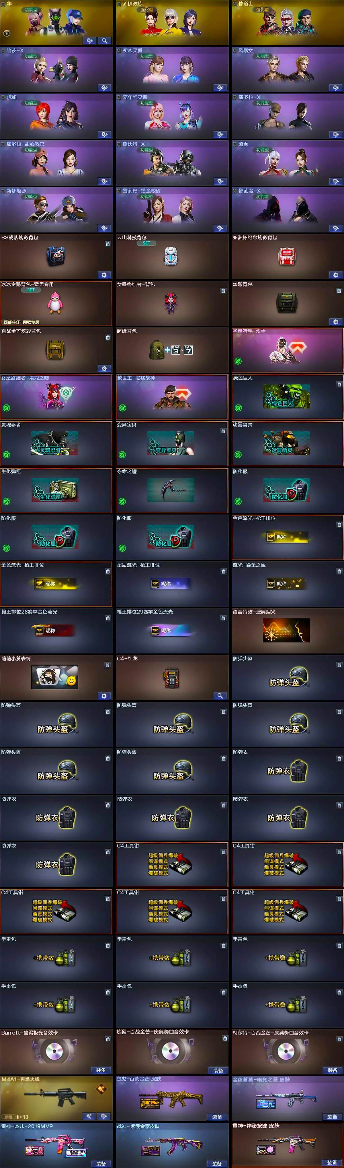 【皮肤】:白虎-百战金芒 皮肤,金色蔷薇-电竞之星 皮肤,雷神-宠儿-2019MVP,M4A1-再燃火线,雷神-神秘按键 皮肤,毁灭-英雄计划 皮肤,战神-紫绶金章皮肤,AK47-B-常胜将军-曹操,AK47-B-常胜将军-刘备,AK47-B-常胜将军-孙权*2,轻型军用手斧-再燃火线
