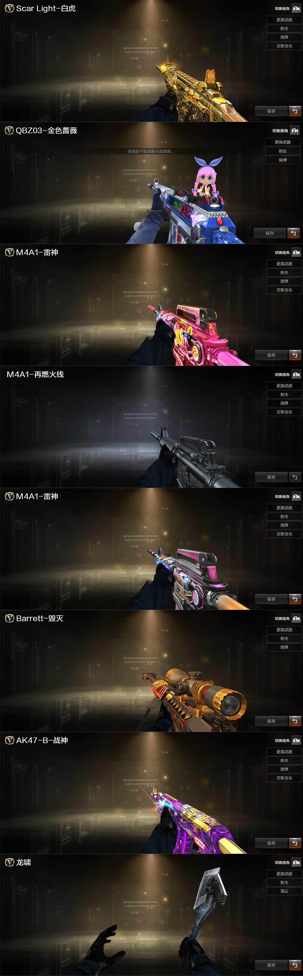 【英雄级武器】:AK47-火麒麟,M4A1-雷神,无影-神兵利器,黑武士-锦绣游龙,M4A1-猎神,AK-47-猩红传说,AK47-B-战神,AK47-B-常胜将军,白虎-电玩蓝兔,Barrett-毁灭,M200-幻神,王者风神-觉醒版,炼狱-百战金芒,汤姆逊-烈龙,沙鹰-修罗,屠龙,麒麟刺,幻灵之锋,炽芒蝶刃,麒麟刺-百战金芒,闪光弹-夜魔,烟雾弹-幻灵,M4A1-赤狱骑士,Barrett-碧霄极光*2