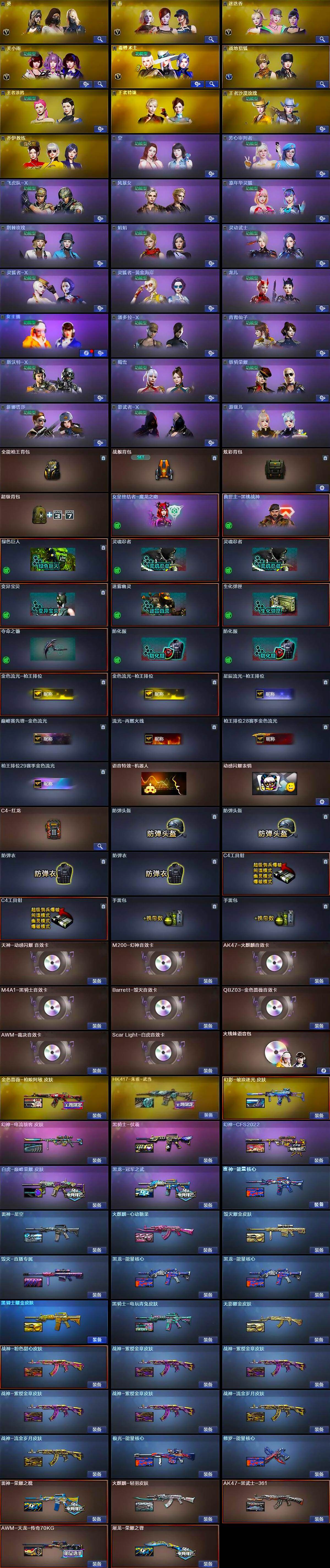 【皮肤】:幻神-CFS2022,幻神-电流骇客 皮肤,白虎-巅峰荣耀 皮肤,金色蔷薇-枪娘阿敏 皮肤,雷神-能量核心,雷神-荣耀之魄,雷神-星空,火麒麟-轻羽皮肤,火麒麟-心动糖果,毁灭耀金皮肤,毁灭-直播专属,黑龙-能量核心*2,黑龙-冠军之武,黑骑士耀金皮肤,黑骑士-伏羲,黑骑士-电玩青兔皮肤,无影耀金皮肤,AK47-黑武士-361,HK417-朱雀-武当,幻影-破浪逐光 皮肤,战神-粉色甜心皮肤,战神-紫绶金章皮肤*4,战神-流金岁月皮肤*2,AWM-天龙-传奇70KG,极光-能量核心,修罗-能量核心,屠龙-荣耀之锋