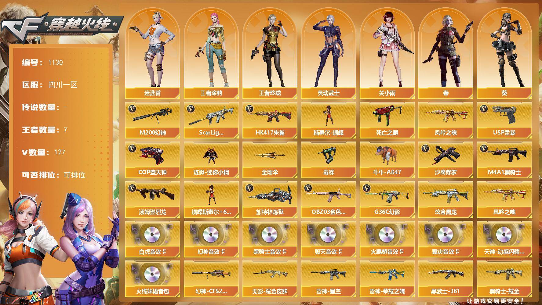 [16484027]四川一区-132V-7王者武器数-1炫金武器数 【热门武器】:G36C-幻影,QBZ03-金色蔷薇,Scar Light-白虎,HK417-朱雀,M200-幻神,死亡之眼,凤吟之魄,炼狱-迷你小钢,毒蜂,牛牛-AK47,M4A1-黑骑士,汤姆逊-烈龙*6,加特林-炼狱*5,斯泰尔-蝴蝶,USP-雷暴,COP-堕天神,沙鹰-修罗*2,金刚伞 【王者炫金武器】:凤吟之魄,炫金黑龙 【音效卡】:天神-动感闪耀 音效卡,M200-幻神音效卡,AK47-火麒麟音效卡,M4A1-黑骑士音效卡,Barrett-毁灭音效卡,AWM-裁决音效卡,Scar Light-白虎音效卡,火线妹语音包 【皮肤】:幻神-CFS2022,幻神-电流骇客 皮肤,白虎-巅峰荣耀 皮肤,金色蔷薇-枪娘阿敏 皮肤,雷神-能量核心,雷神-荣耀之魄,雷神-星空,火麒麟-轻羽皮肤,火麒麟-心动糖果,毁灭耀金皮肤,毁灭-直播专属,黑龙-能量核心*2,黑龙-冠军之武,黑骑士耀金皮肤,黑骑士-伏羲,黑骑士-电玩青兔皮肤,无影耀金皮肤,AK47-黑武士-361,HK417-朱雀-武当,幻影-破浪逐光 皮肤,战神-粉色甜心皮肤,战神-紫绶金章皮肤*4,战神-流金岁月皮肤*2,AWM-天龙-传奇70KG,极光-能量核心,修罗-能量核心,屠龙-荣耀之锋 【角色】:葵,春,迷迭香,关小雨,毒蝰术士,战地猎狐,王者涂鸦,王者玲珑,王者沙漠玫瑰,狐影,乔伊教练,空,芳心审判者,飞虎队-X,风暴女,嘉年华灵狐,荆棘玫瑰,娟娟,灵动武士,灵狐者-X,灵狐者-黄金海岸,流浪蔷薇,龙儿,女主播,潘多拉-X,青霞仙子,斯沃特-X,蜀雪,铁骑荣耀,新娜塔莎,影武者-X,游珑儿 【人偶武器】:炼狱-迷你小钢,斯泰尔-蝴蝶,加特林-机械猎手,泡泡象COP357,AWM-灵狐-15周年嘉年华,M37-葵,COP-旗袍,牛牛-AK47,迷你深渊冰龙,迷你牛牛,迷你生化手雷*2,闪光弹-小乔 【暴走生化】:毒蜂,死亡之眼,超级对讲机 【挑战大师】:神圣爆裂者III,试炼破坏者III,神圣爆裂者-末日III 【英雄级武器】:M4A1-千变,AK47-火麒麟,M4A1-黑龙,M4A1-雷神,M4A1-黑骑士,AK47-无影,AK47-黑武士,AK12-天启,M4A1-武圣,AK47-黑鲨*2,AK47-雷暴,HK417-朱雀,Scar Light-白虎,